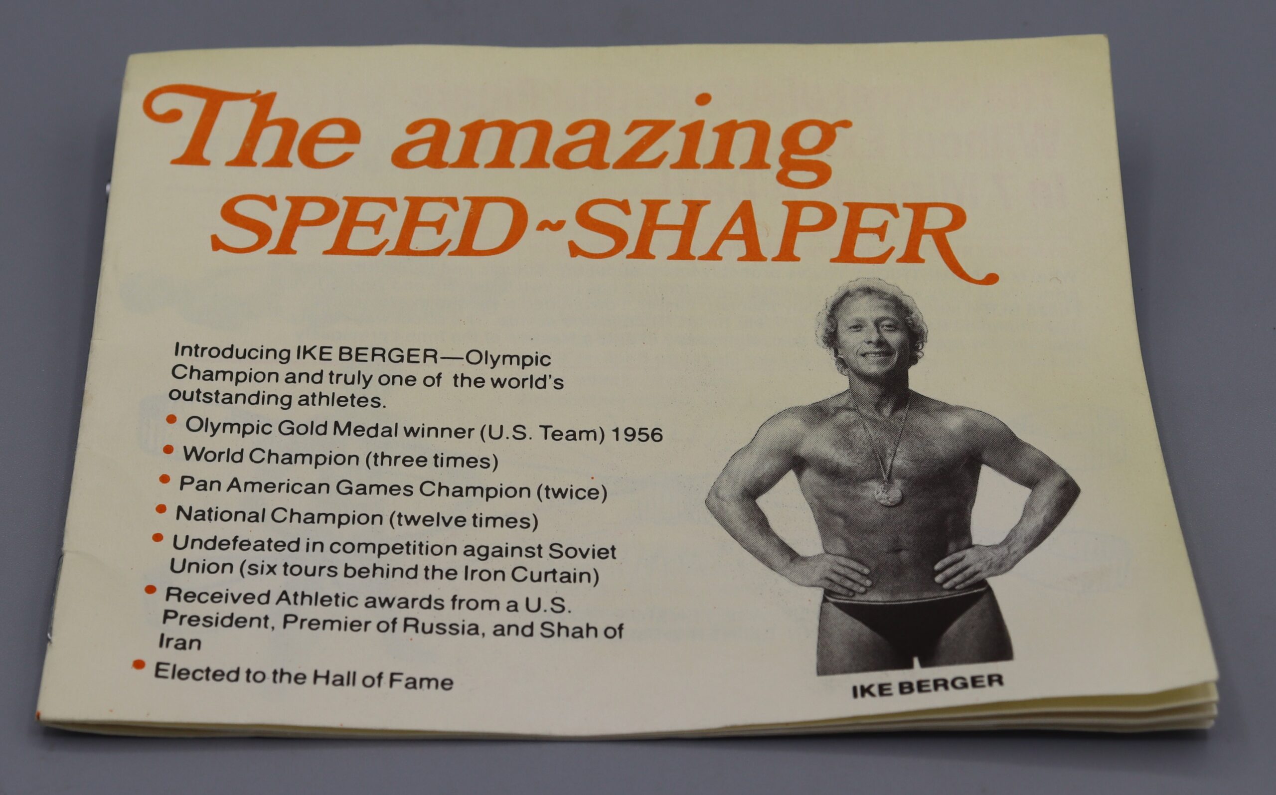 Description: The Amazing Speed-Shaper, elasticated exerciser. Two brown rubber straps with loops, joined by plastic ring. Includes fourteen-page instruction booklet. Endorsed by Olympic weight-lifting champion Isaac ‘Ike’ Berger (1936-2022)