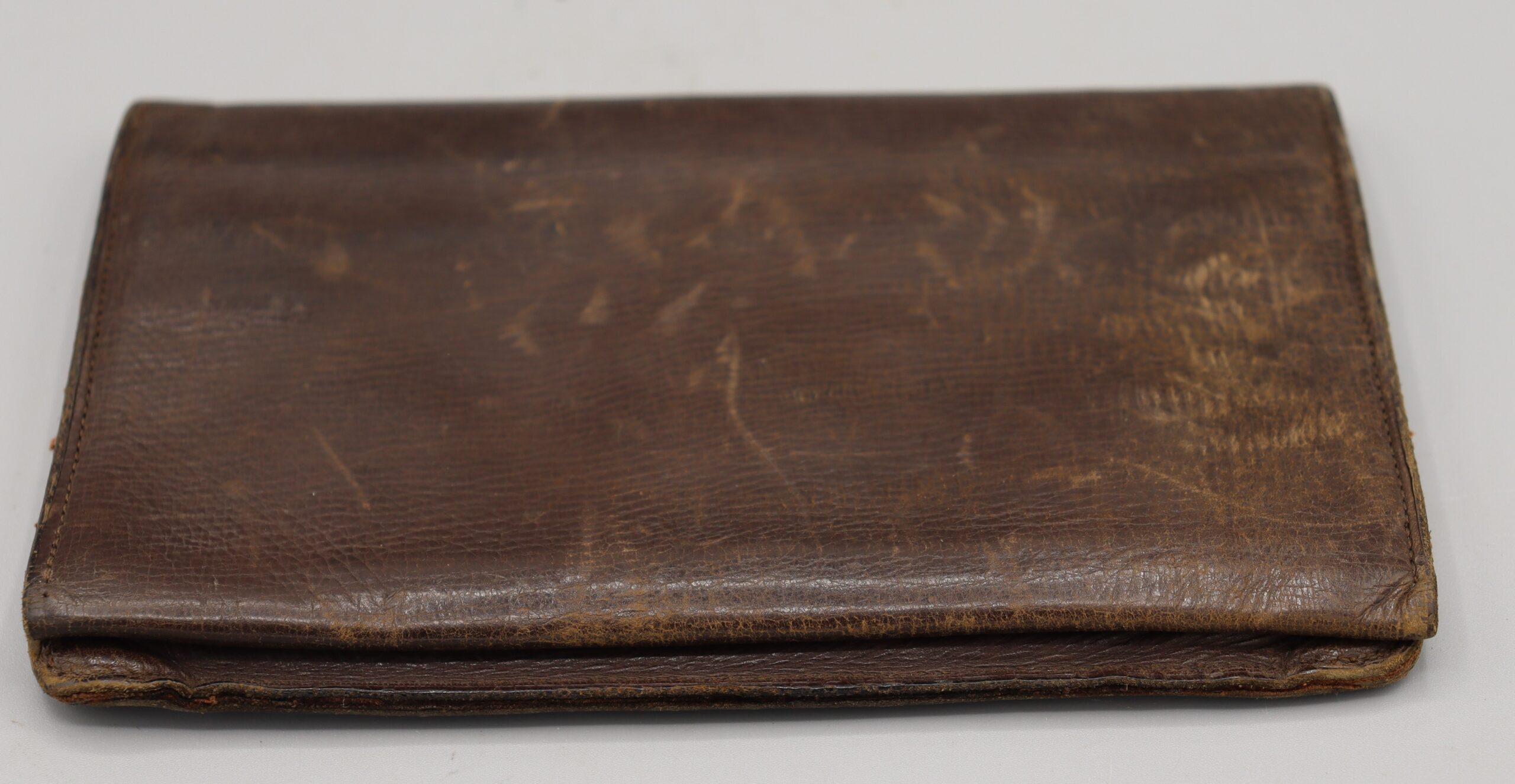 Description: Dark brown leather wallet 10cm x 16cm, with six card compartments and coin purse. Scuffed, no other markings