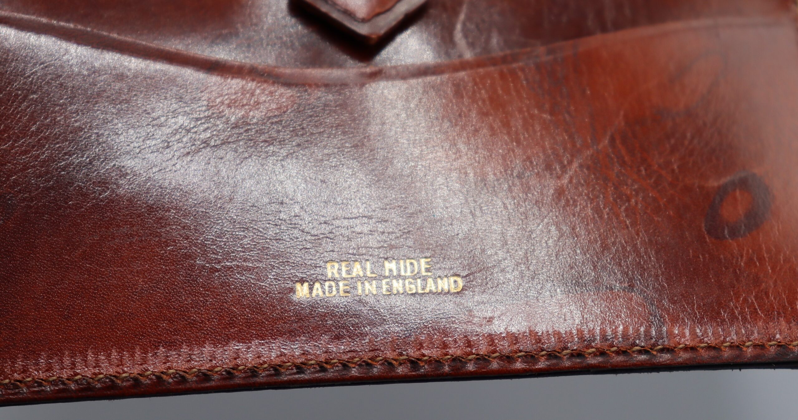 Description: Chestnut brown leather wallet 10cm x 16cm, with interior zip, three card compartments and coin purse. Marked ‘Real Hide, Made in England’