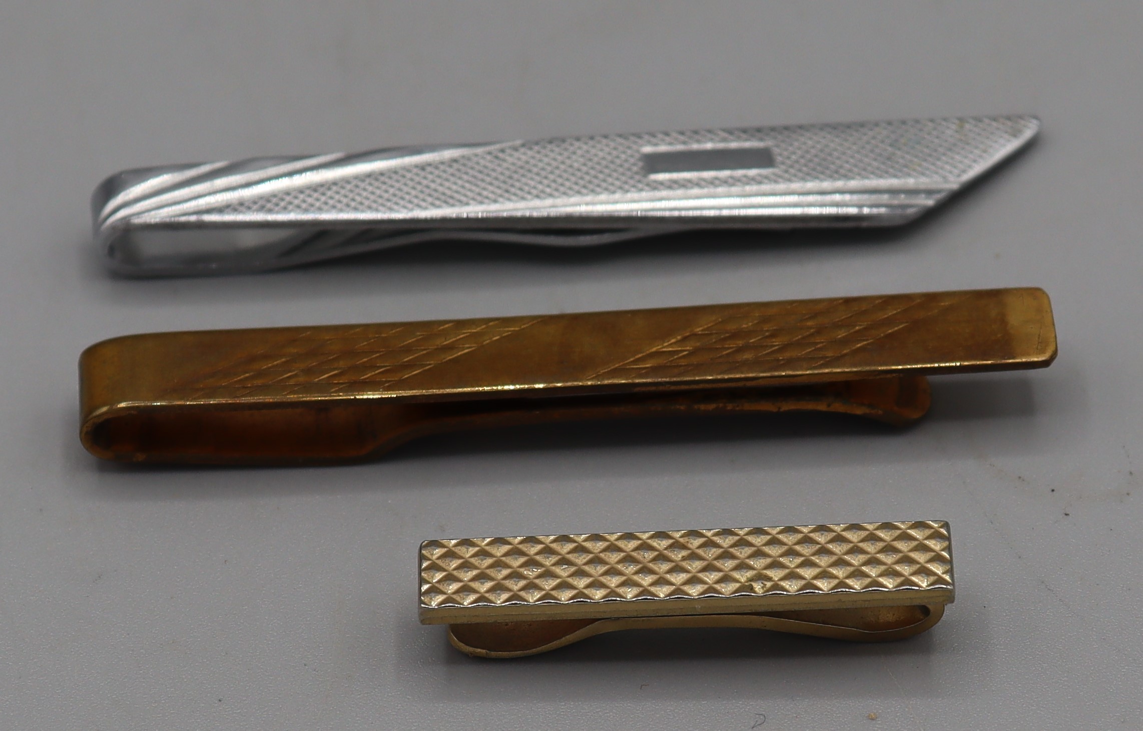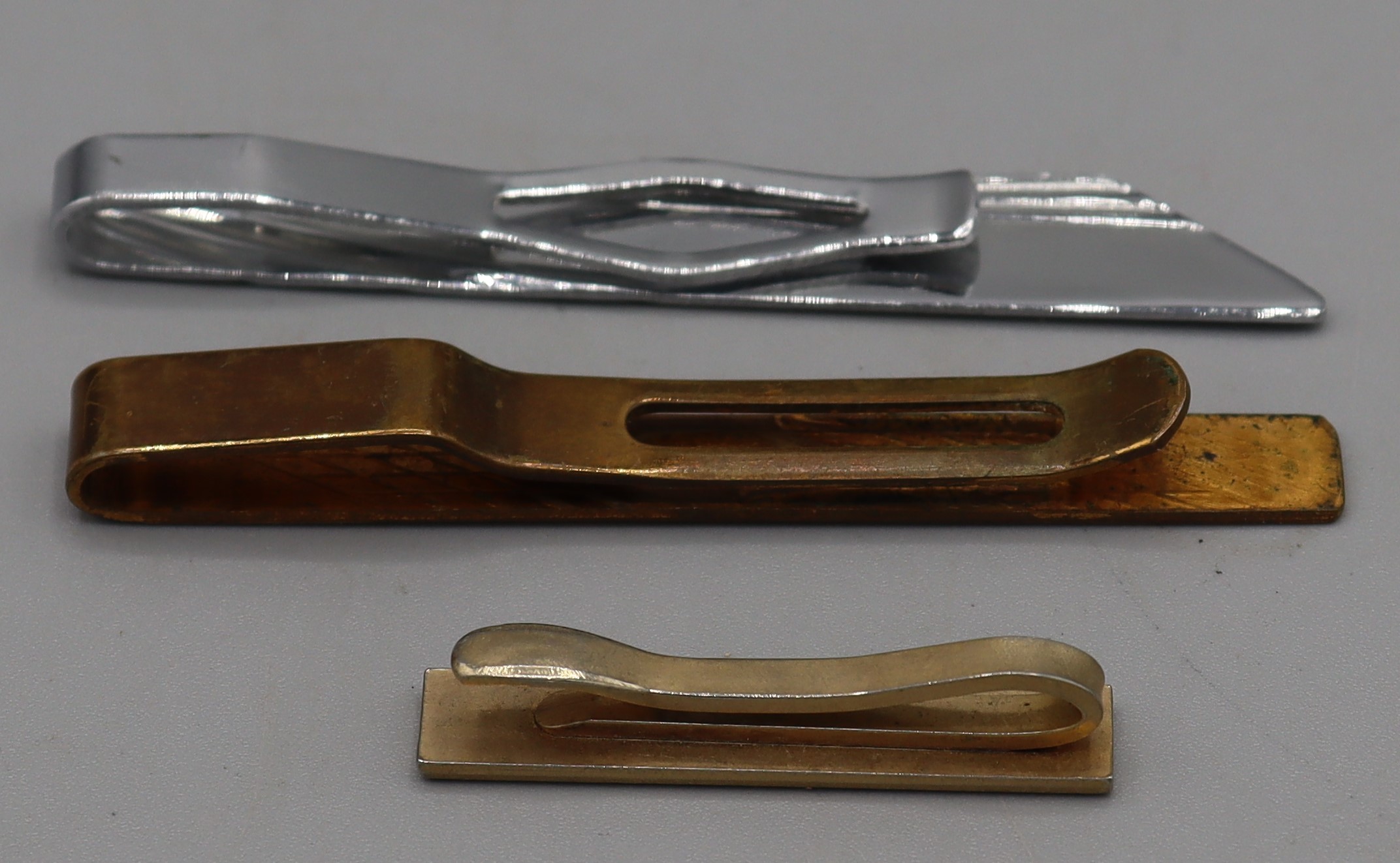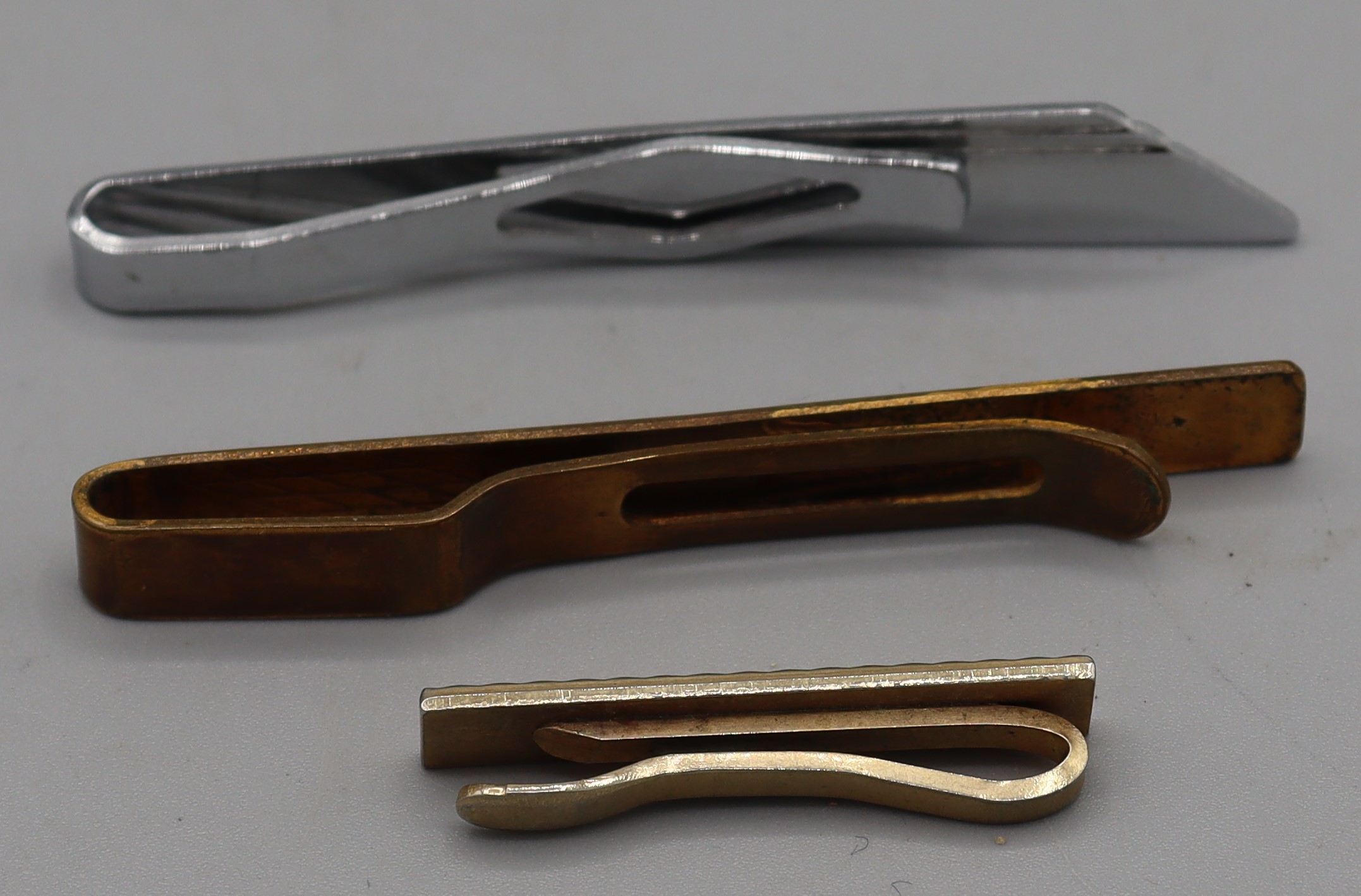 Description: 3 Sprung Metal Tie Clips. 1 x silver metal, tie design, 7cm long. 1 x gold metal, diamond pattern, 2cm long. 1 x brass metal, diamond design, 6.6cm long