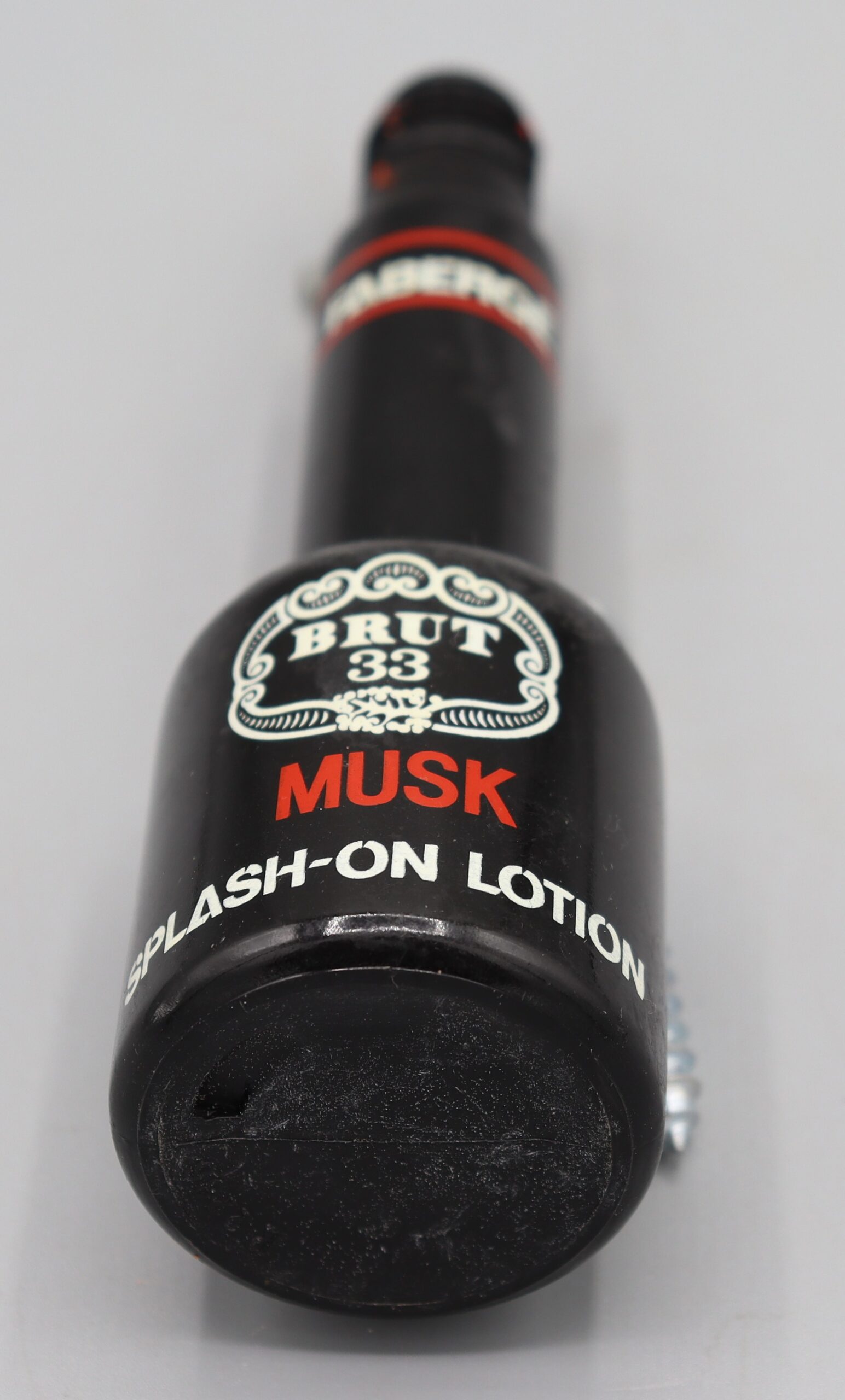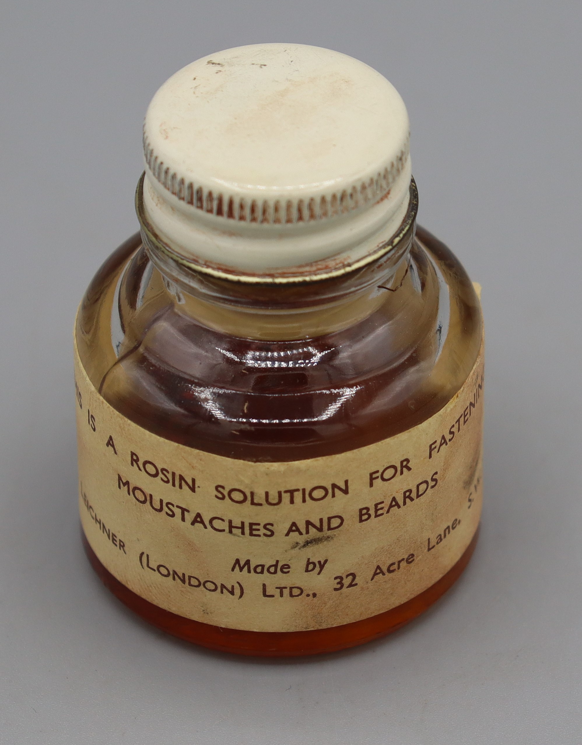 Description: Leichner spirit gum substitute in glass jar labelled ‘No. 1065’, Label states, ‘This is a rosin solution for fastening moustaches and beards’, ‘Made by L. Leichner (London) Ltd., 32 Acre Lane, S.W.2’. Jar still contains a solidified amber substance.