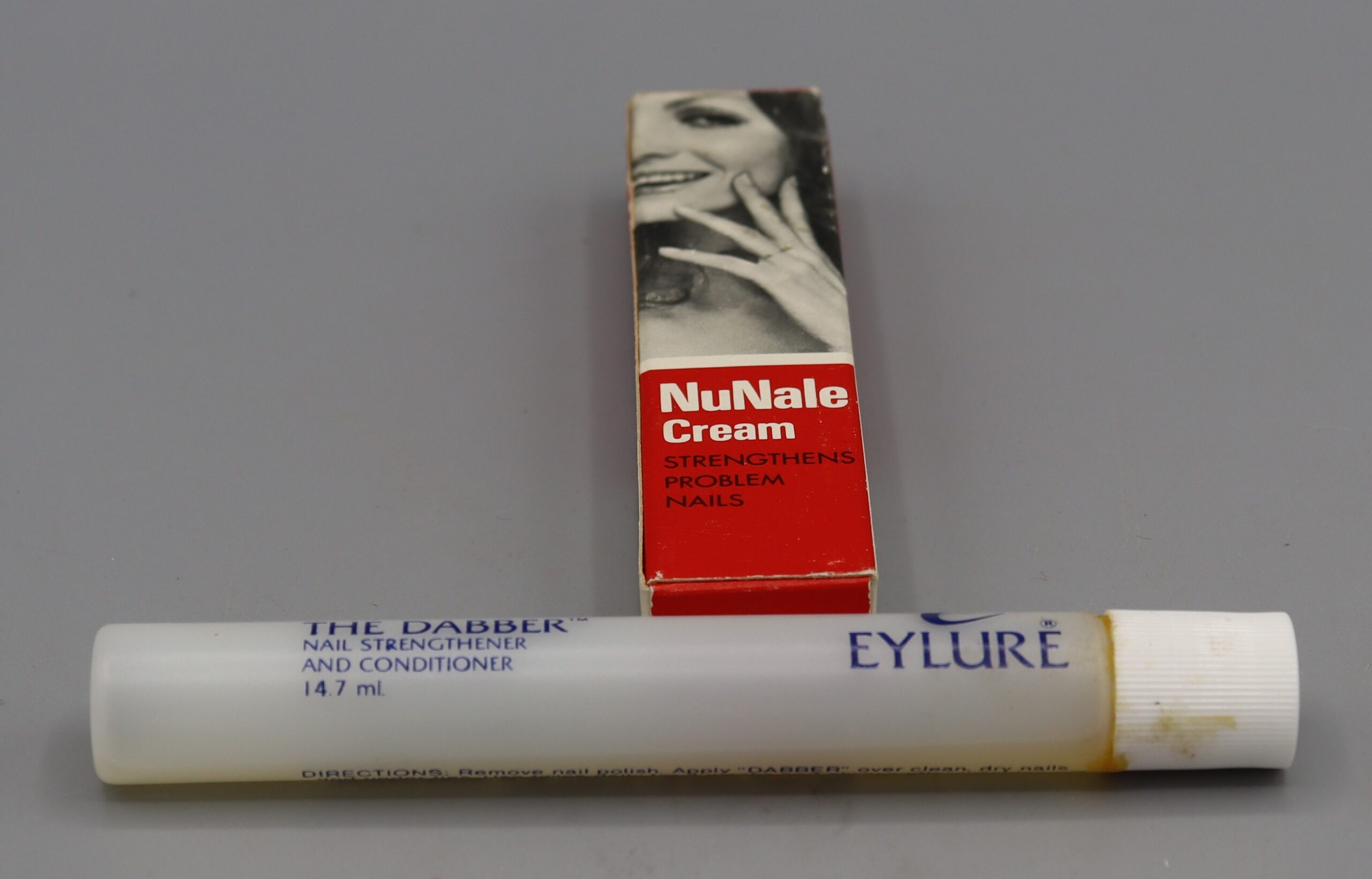 Description: 1 x Eylure, ‘Dabber’ Nail Strengthener and Conditioner, 14.7 ml. contains liquid. 1 x NuNail Cream, ‘Strengthens Problem Nails’, plastic tube in original cardboard packaging with applicator