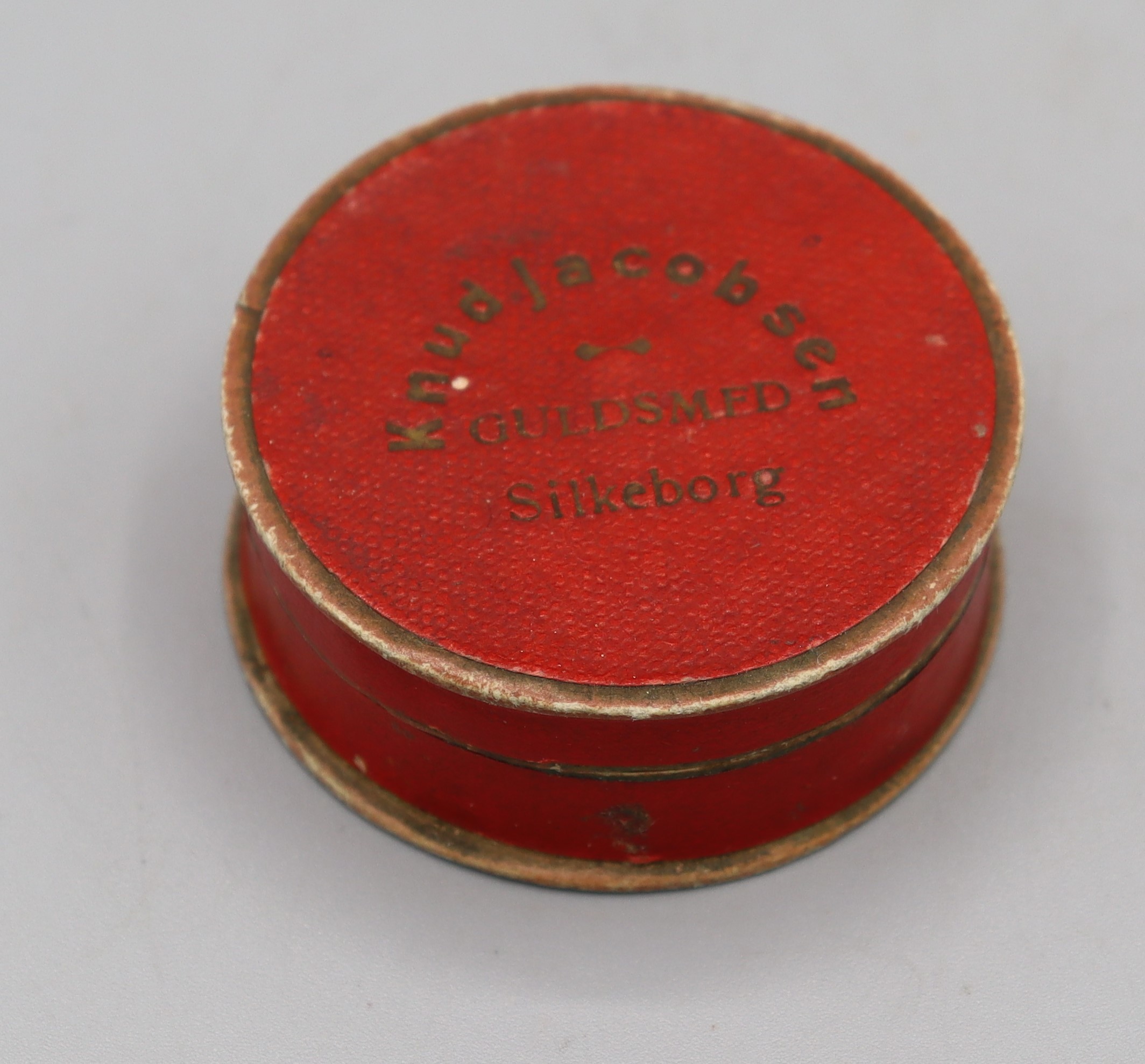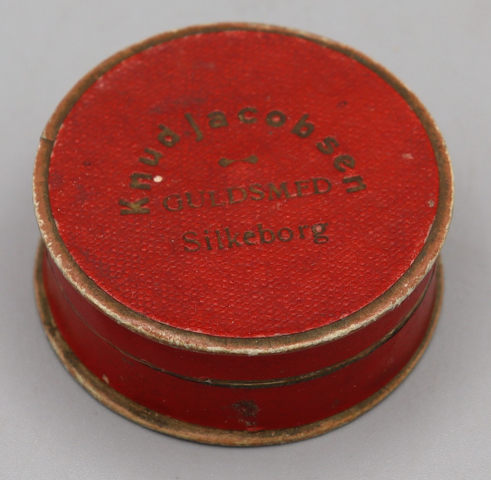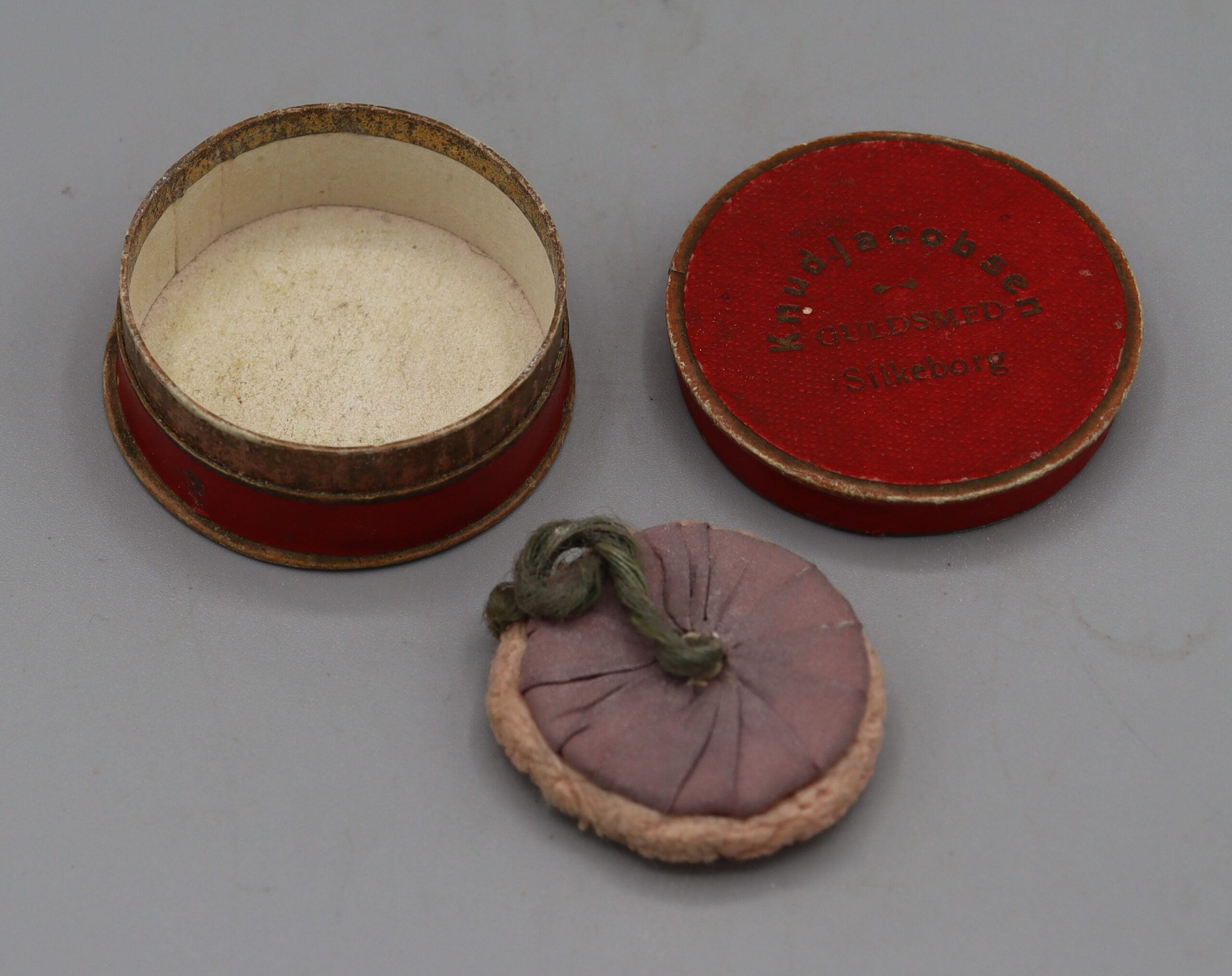 Description: Circular Jewellery box, red cardboard, containing a mauve piece of cloth which contains cosmetic powder. ‘Knud Jacobsen Guldsmed Silkeborg Denmark’ written on box in gold. Silkeborg was a gold and silver smith with no connection to cosmetics.