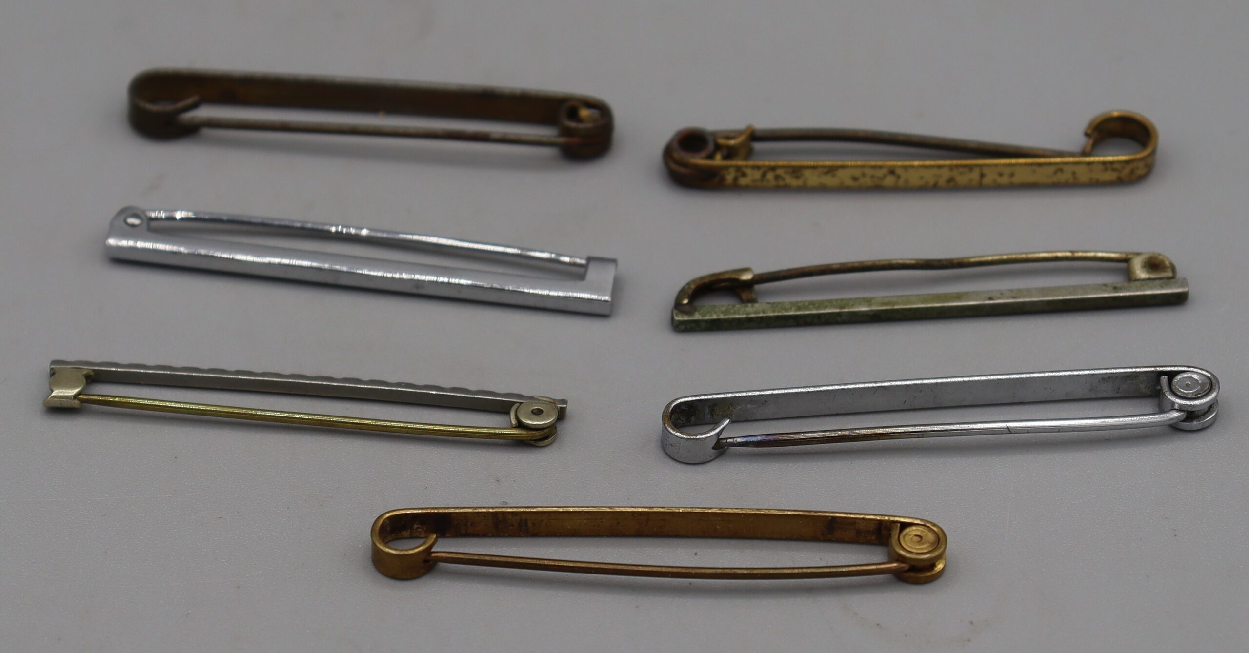 B1_008050 Tie Pins (x7) Item Reference: 008050 Category: Personal Accessories (Gents) Format: Artefact Description: 7 plain tie pins. 5 x silver-tone and 2 x gold-tone Date: Further Information: Links: B1_008050