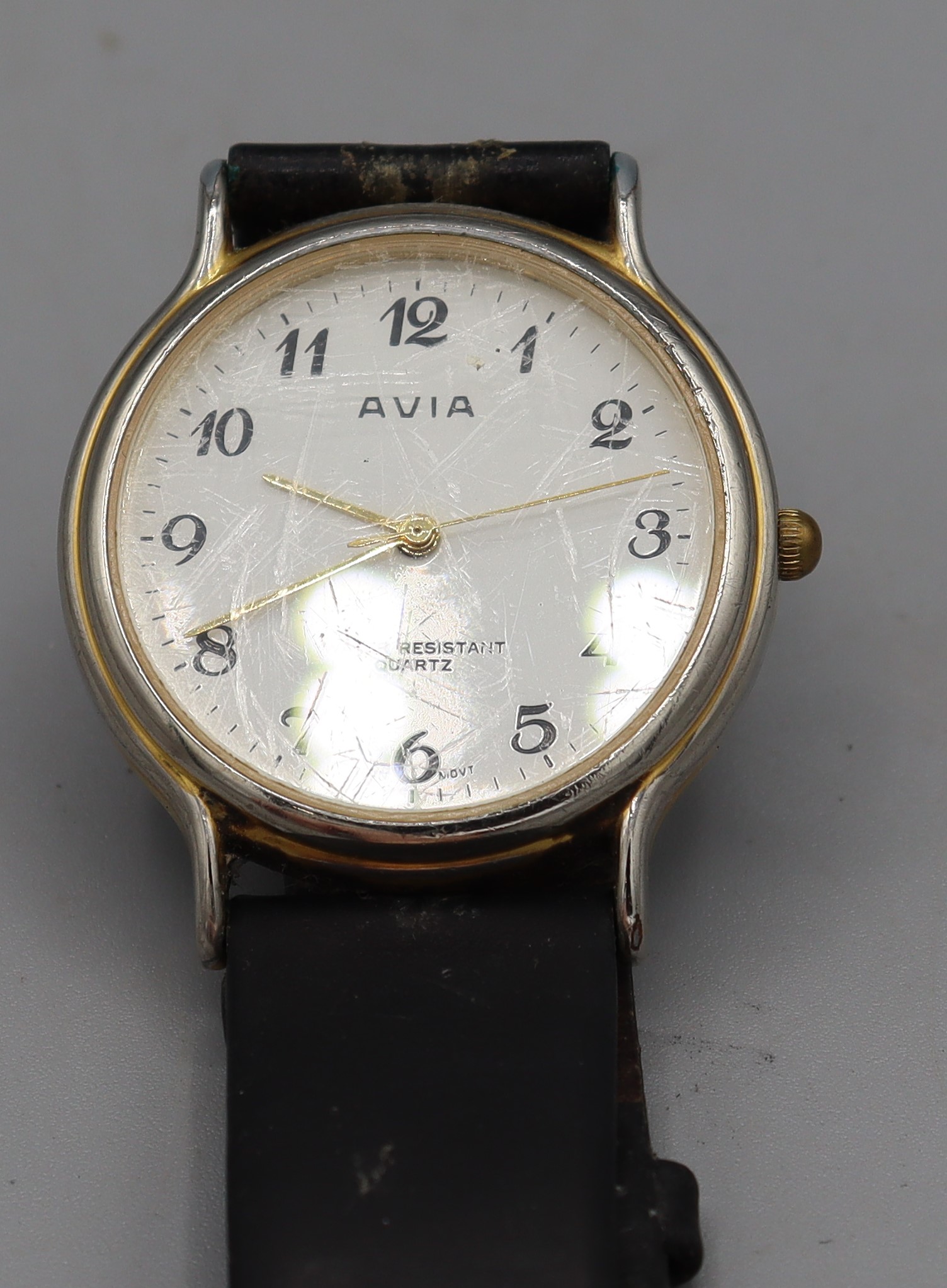 Description: Avia quartz wristwatch with stainless steel back and gold-plated top. Marked ‘water-resistant’. Ref, 246971. Black leather wrist-strap