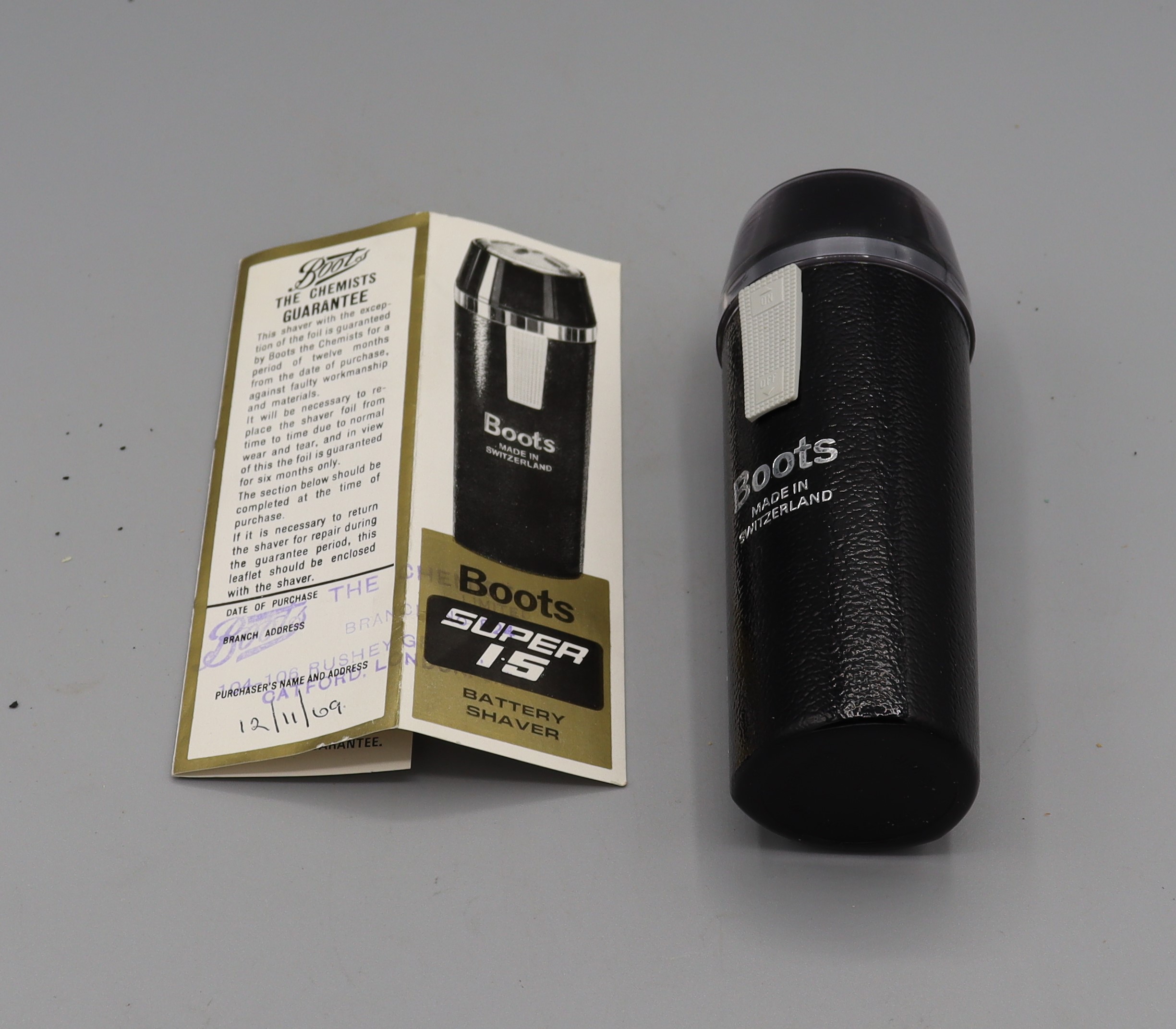 B2.1_008086 Battery Shaver (Boots) Item Reference: 008086 Category: Personal Accessories (Gents) Format: Artefact Description: Battery shaver, branded by Boots the Chemist, in original white cardboard packaging with grey plastic case. Date: Further Information: Links: