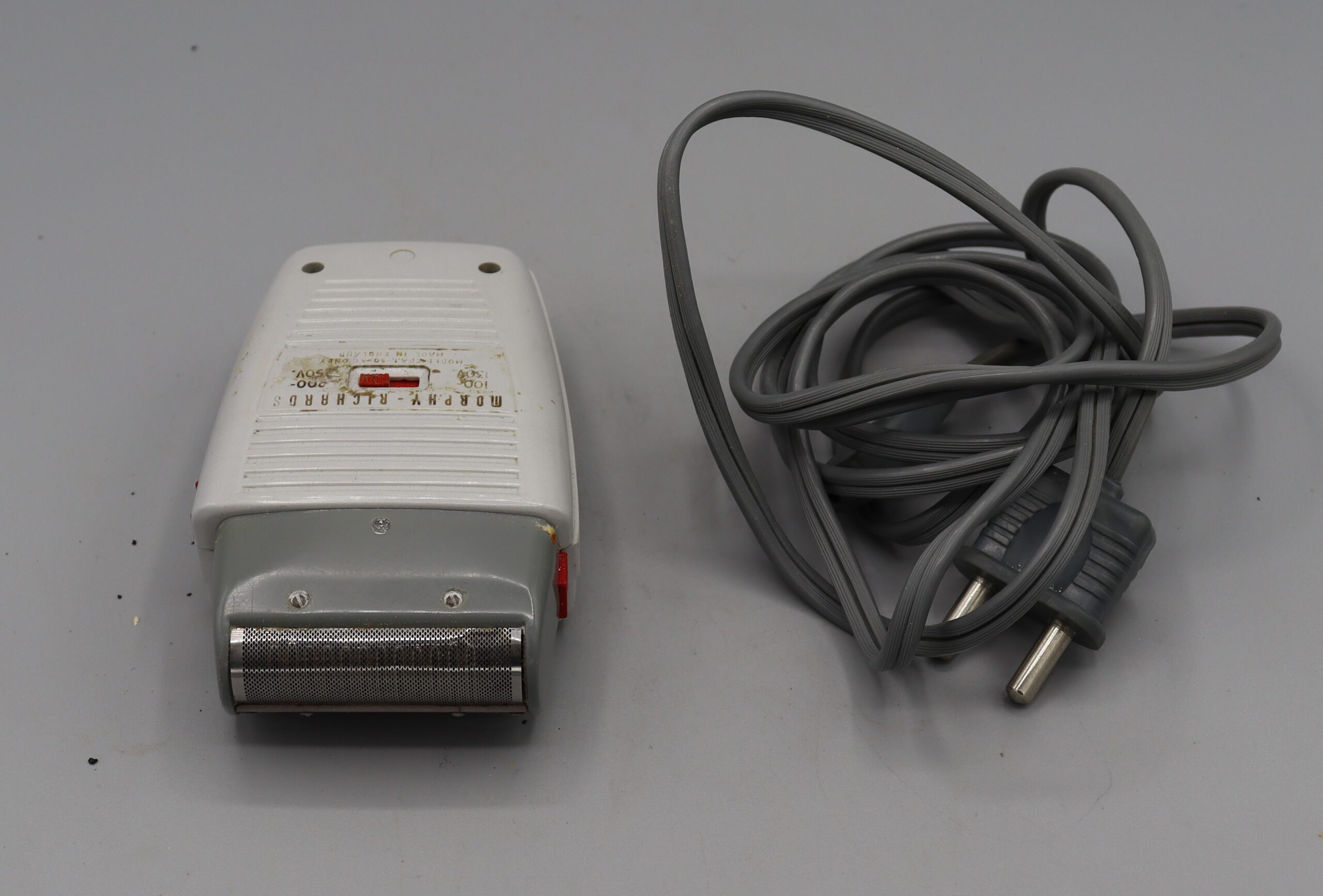 B2.1_008089 Electric Shaver (Morphy-Richards) Item Reference: 008089 Category: Personal Accessories (Gents) Format: Artefact Description: Morphy-Richards electric shaver, grey plastic, with mains power lead Date: 1960s Further Information: Links: