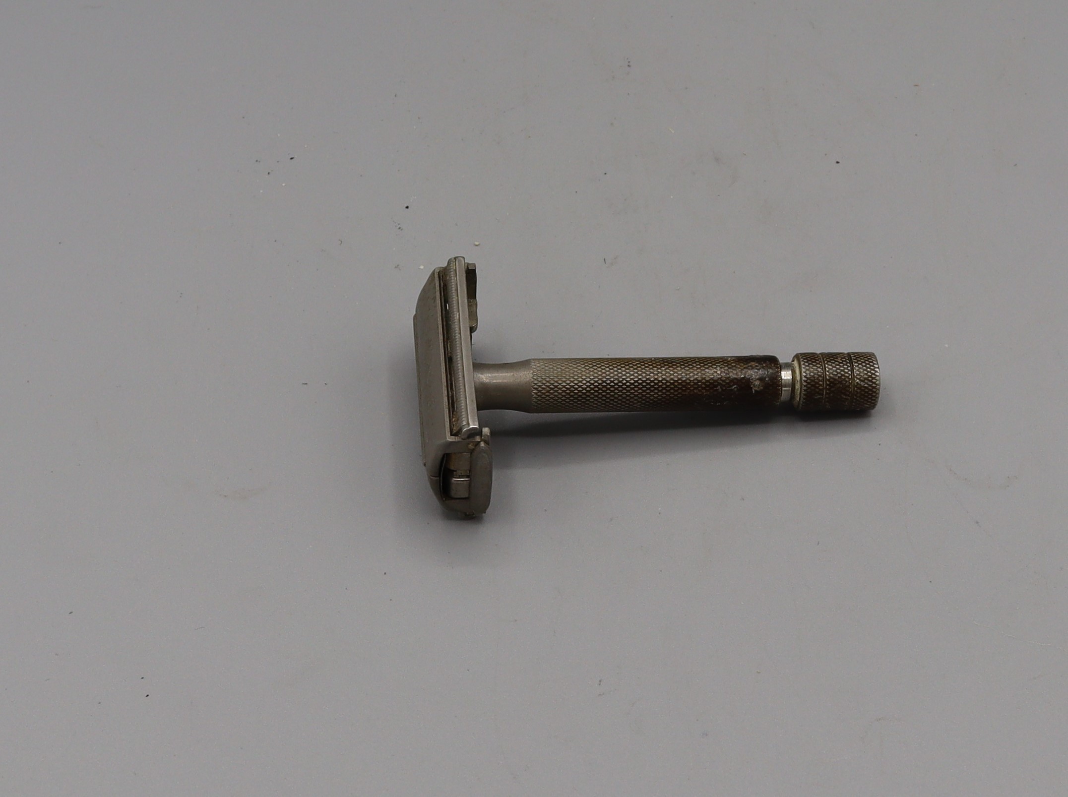 B2.1_008141 Double Edged Safety Razor (80mm) Item Reference: 008141 Category: Personal Accessories (Gents) Format: Artefact Description: Double edged safety razor, twist to open, 80mm long Date: Further Information: Links: