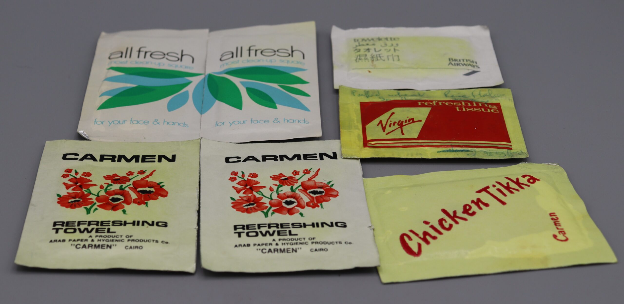 Description: Cleansing Pads (x7). All Fresh brand (x2), Carmen brand with Arabic writing on the back (x3), Virgin Atlantic (x1), British Airways (x1)