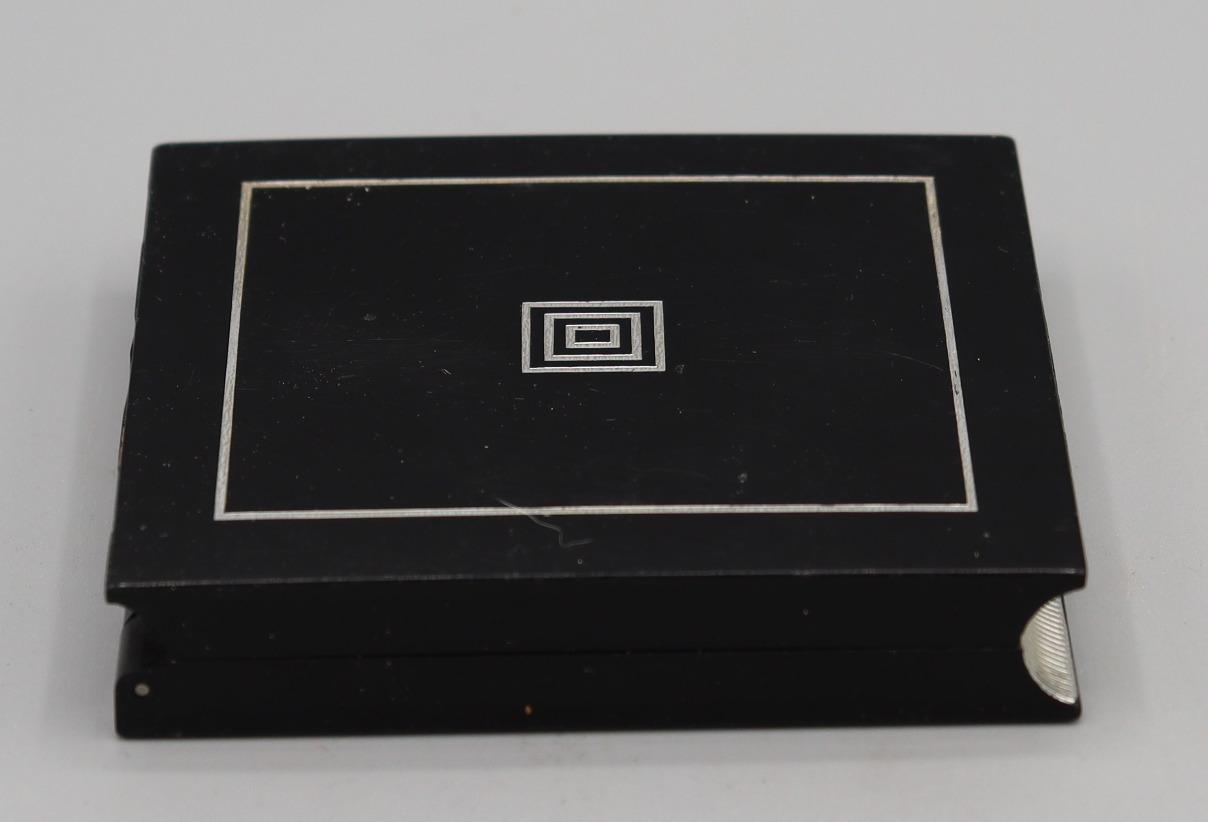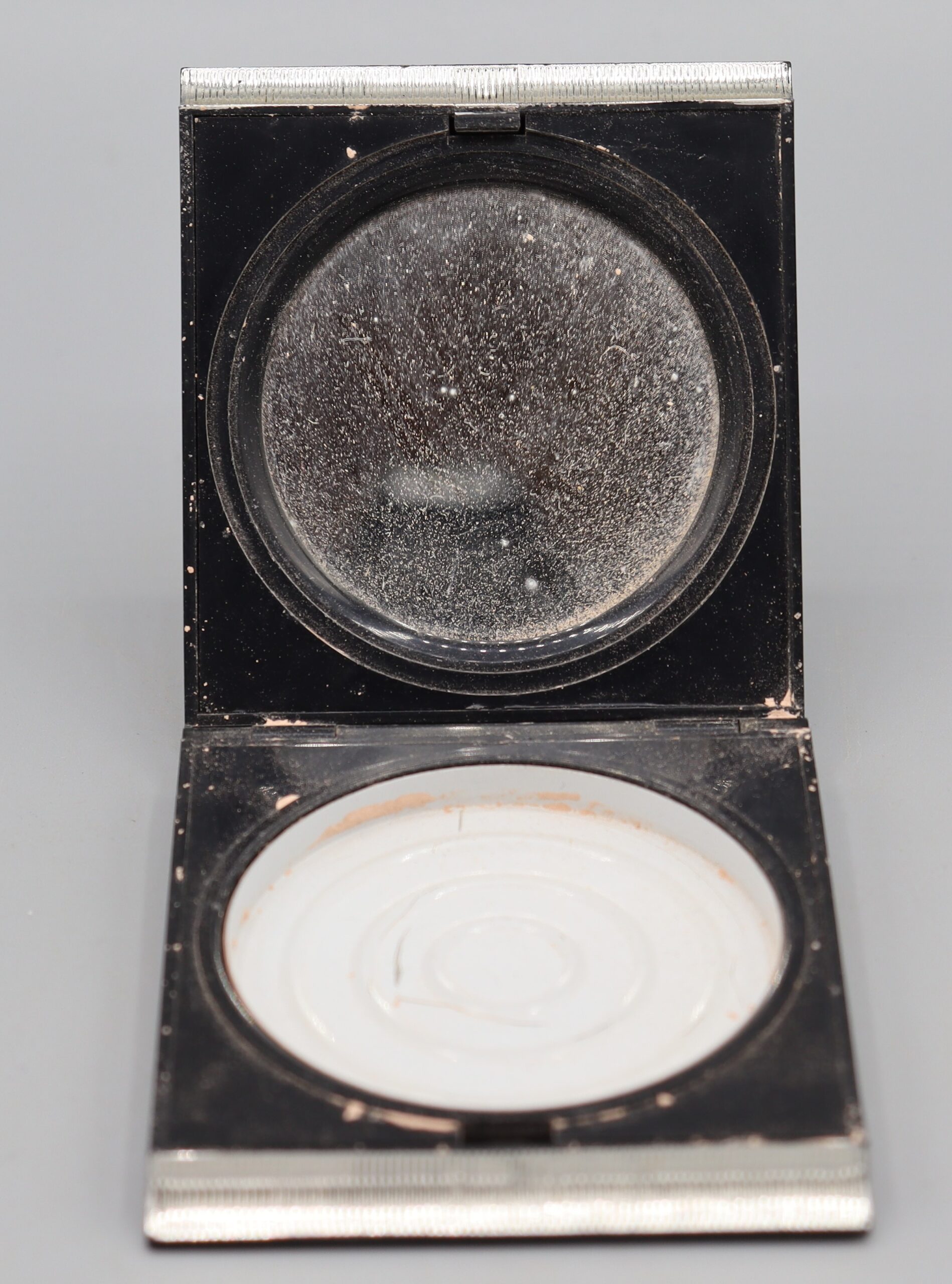 B4_008208 Powder Compact Item Reference: 008208 Category: Personal Accessories (Cosmetics) Format: Artefact Description: Dark coloured powder compact, square patterned, manufactured by Avon cosmetics Date: Further Information: Links: B4_008208_1 B4_008208_5