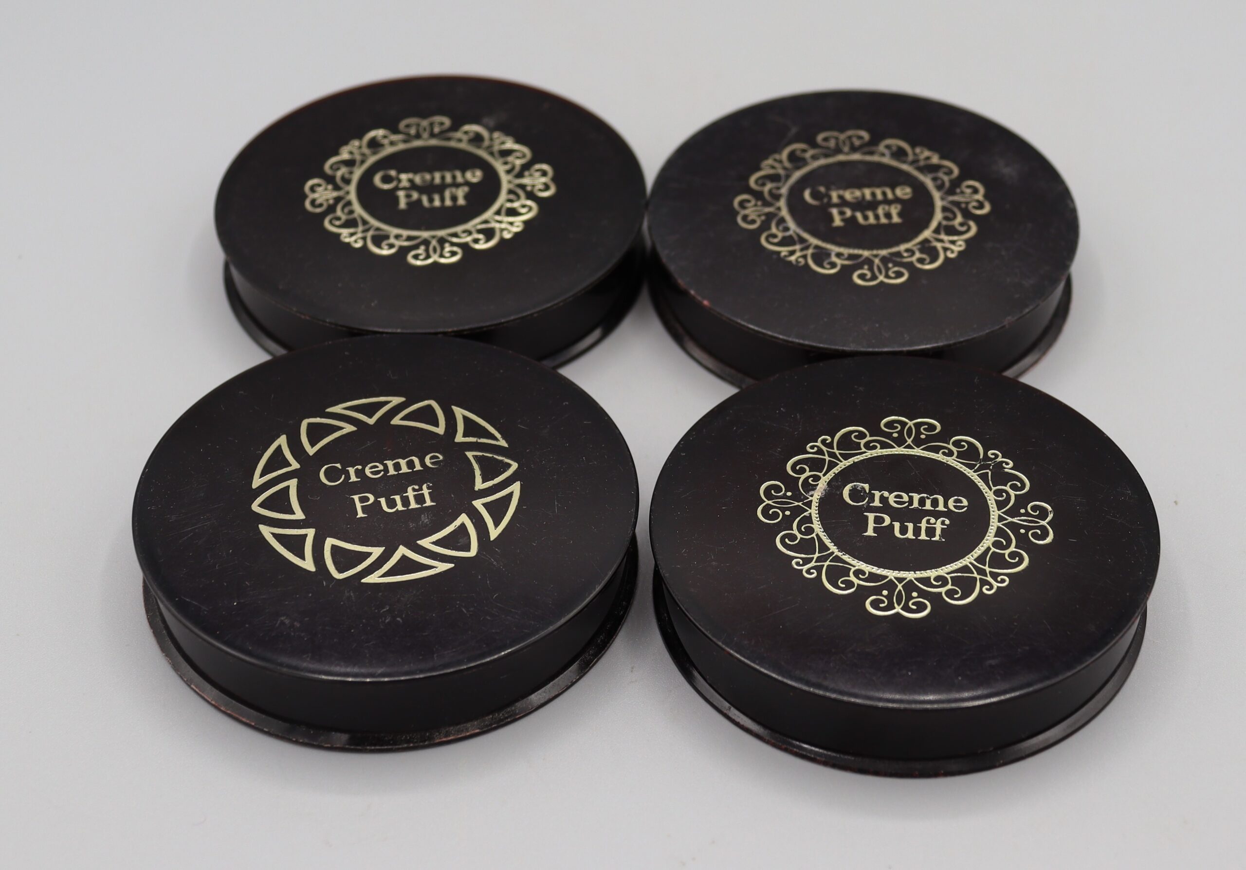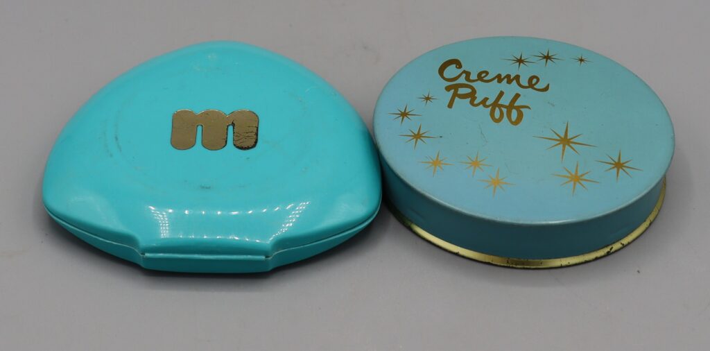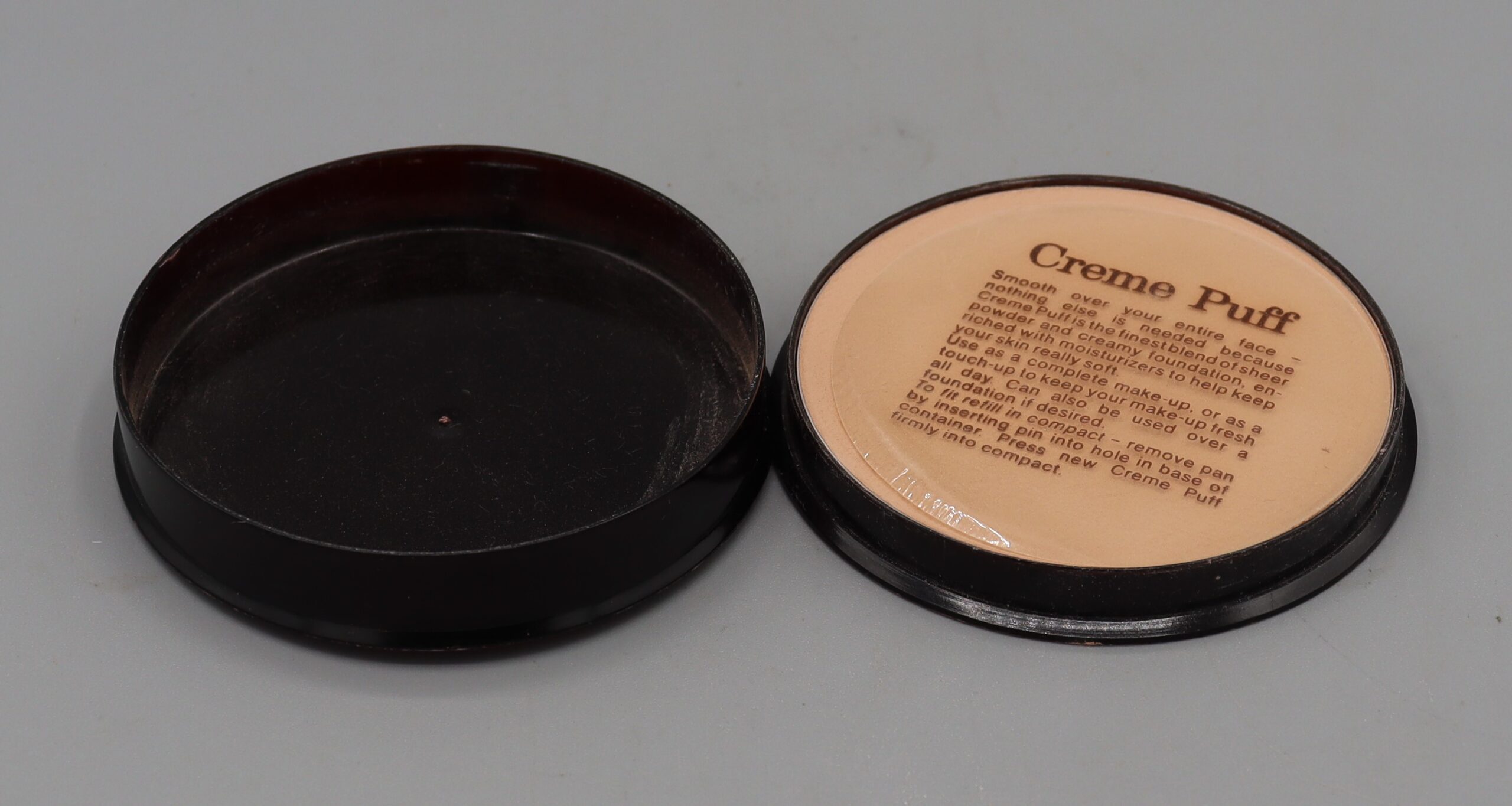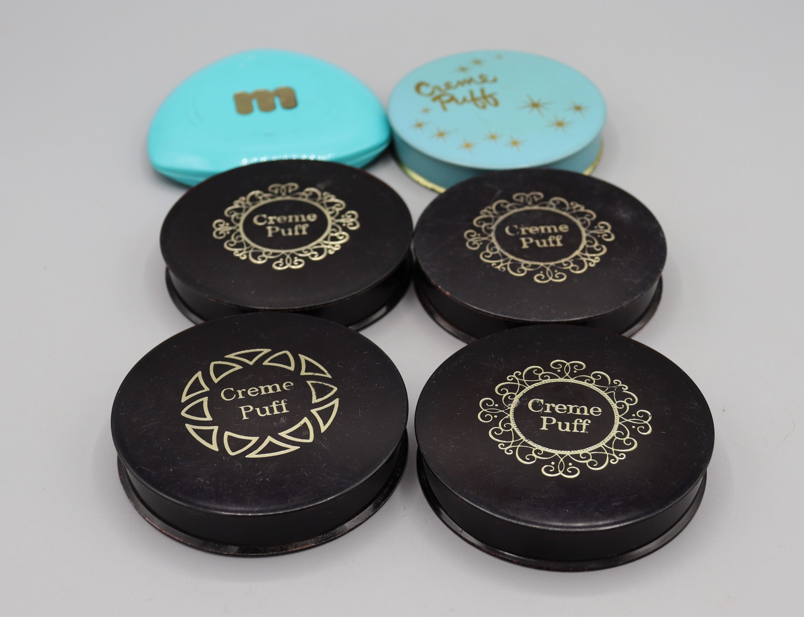 Description: 6 powder compacts. 2 x Max Factor ‘Creme Puff’, brown plastic containers, ‘Truly Fair’; 2 x Max Factor ‘Creme Puff’, brown plastic containers ‘Candle Glow’; 1 x Max Factor ‘Creme Puff’; 1 x Miners Make Up Ltd., ‘Creme Puff Plus’