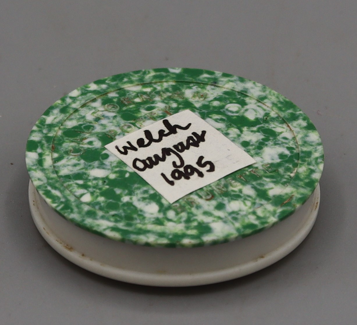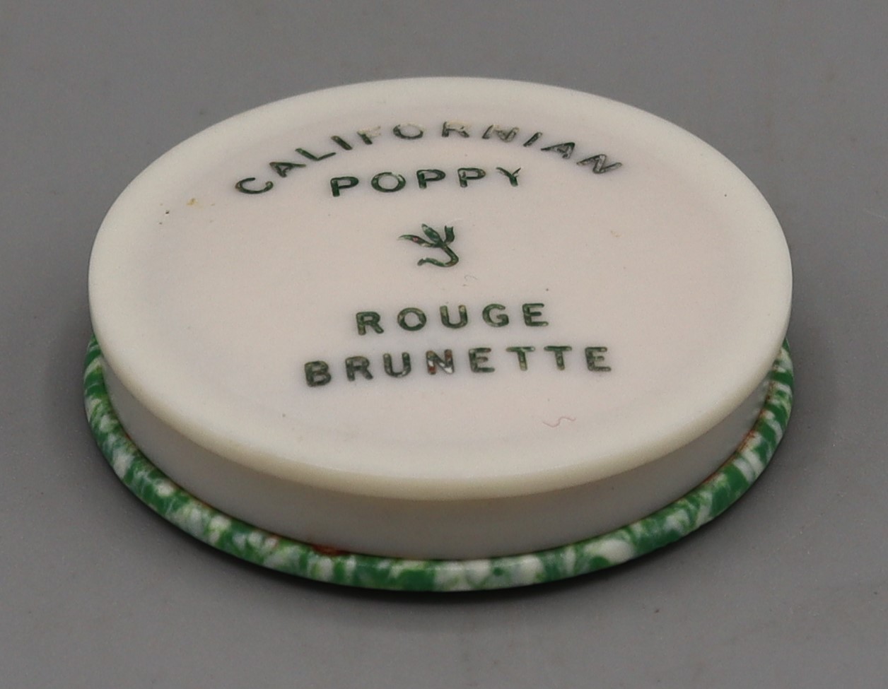 Description: Powder compact, ‘Californian Poppy Rouge Brunette’, labelled ‘Welch August 1995’