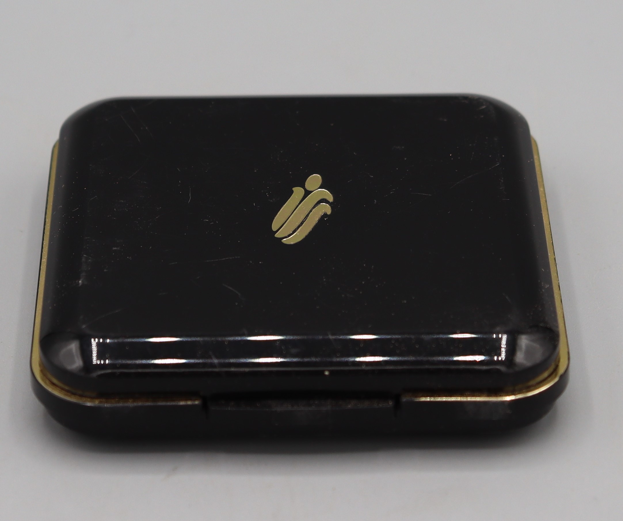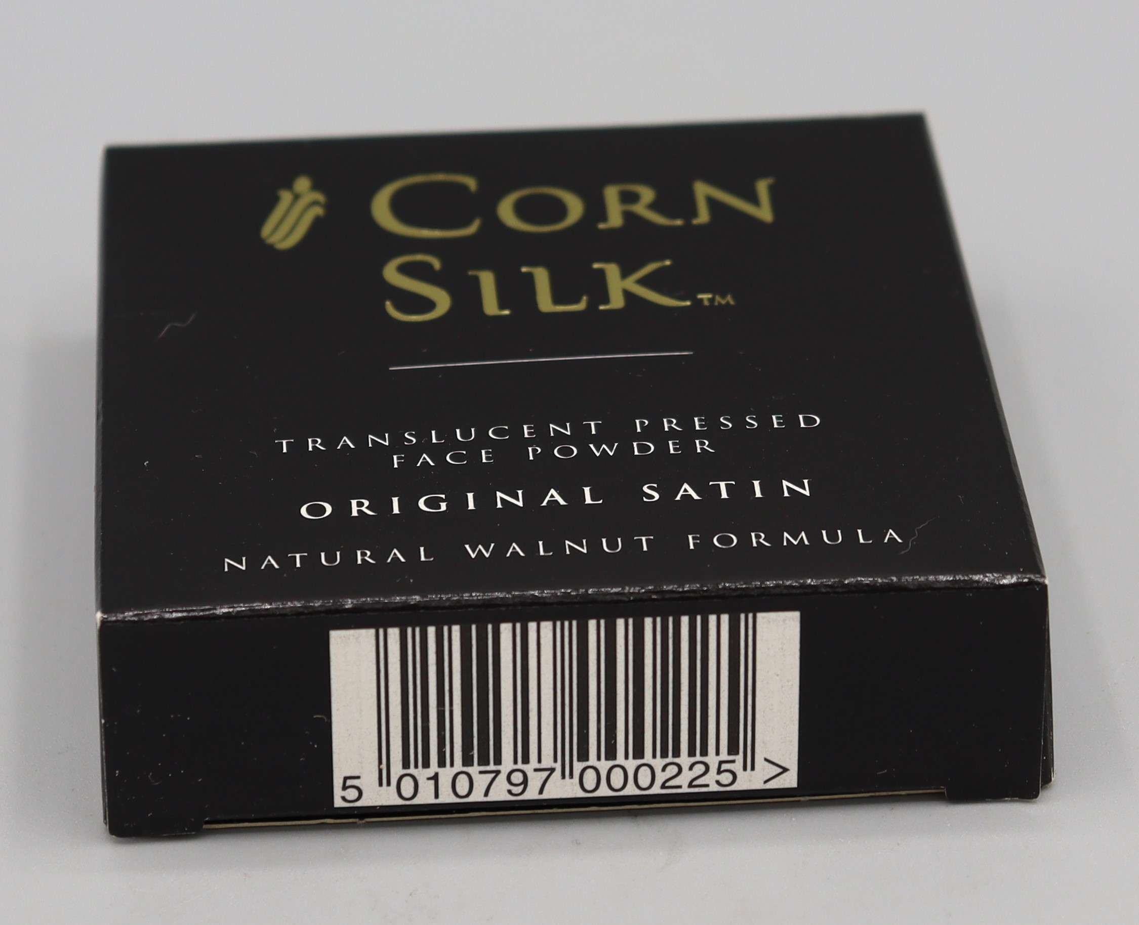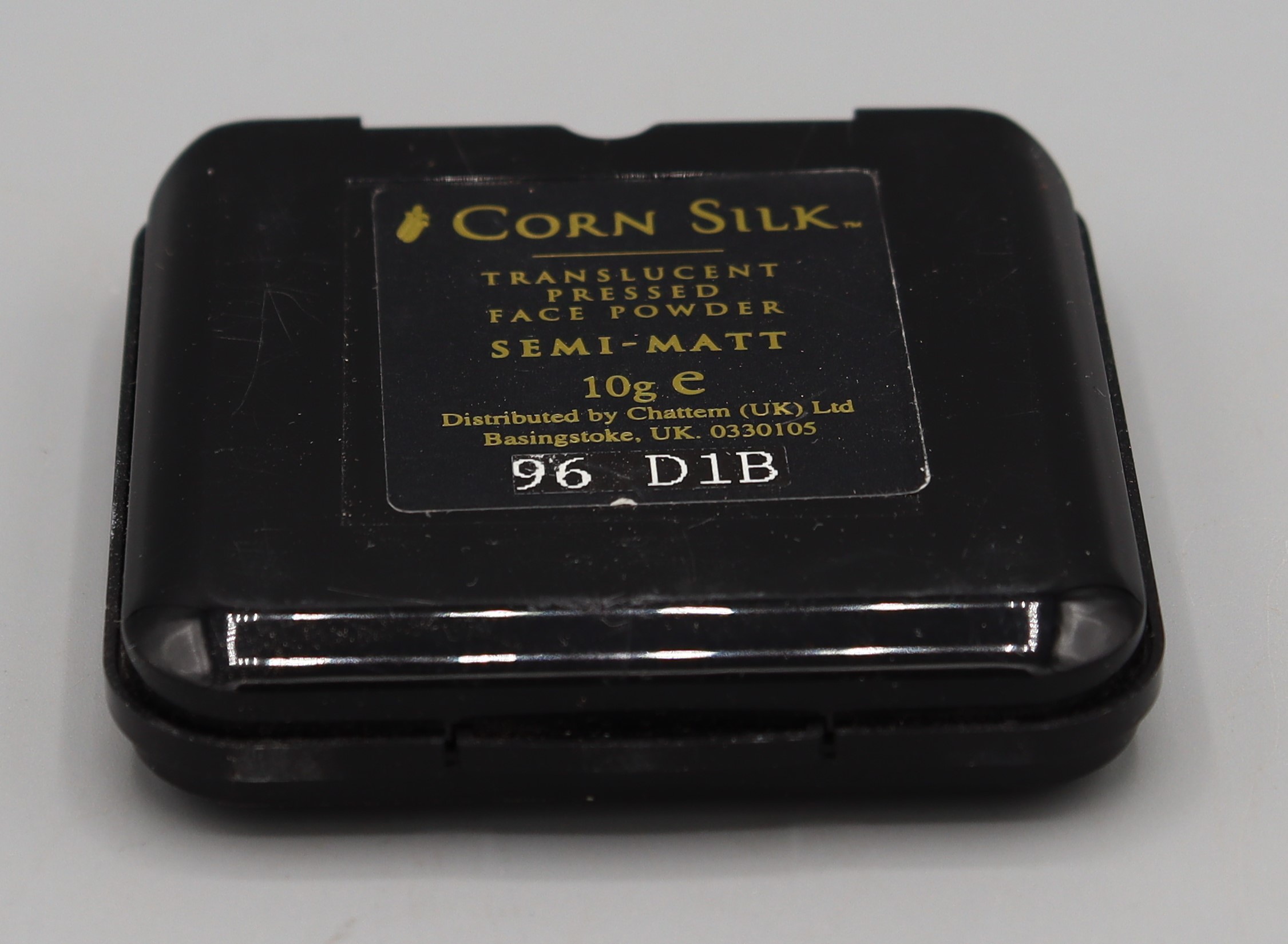 Description: Brown plastic powder compact in original packaging. The box reads ‘Corn Silk Translucent Pressed Face Powder Original Satin Natural Walnut Formula BN97G4A Distributed by Chattem (UK) Ltd Basingstoke UK 0304120 10G’