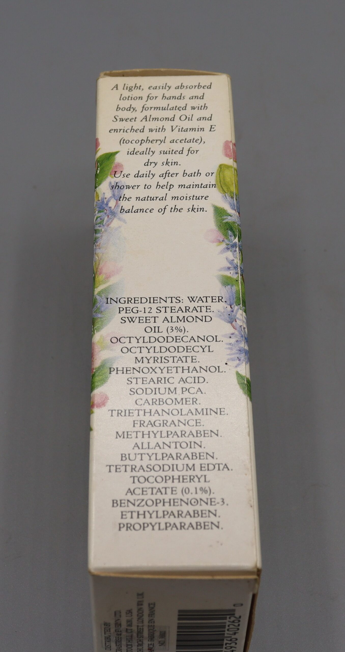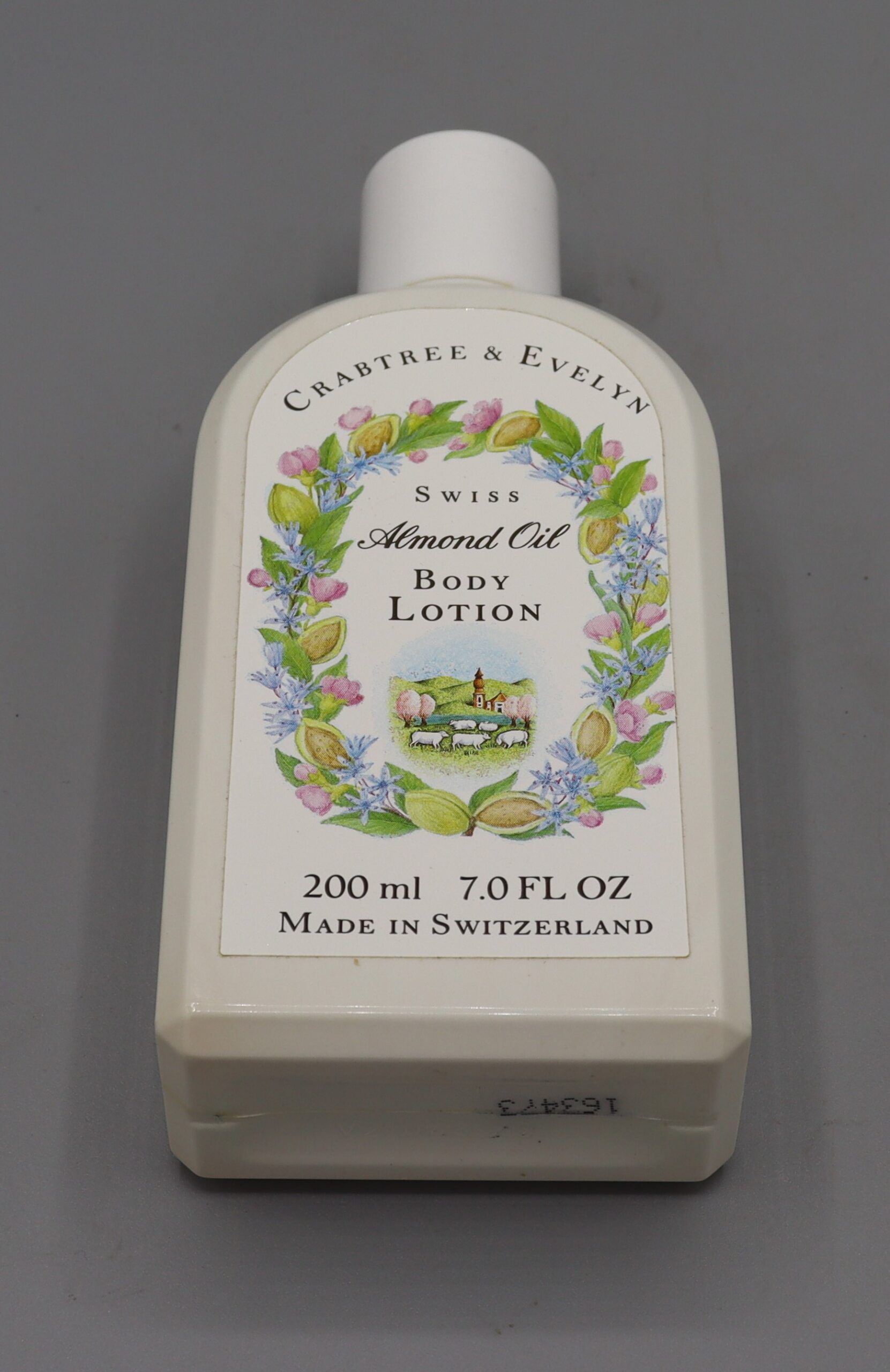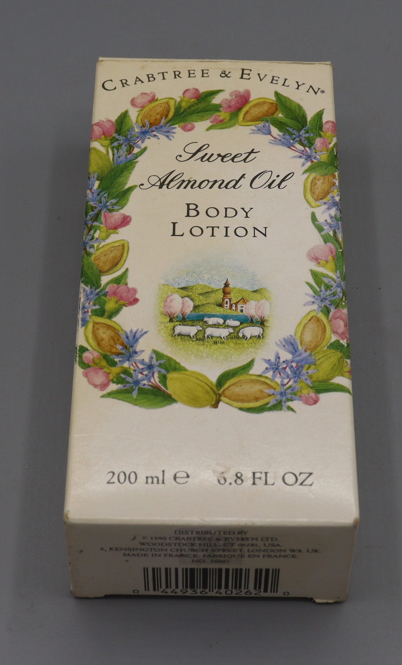 Description: Body lotion bottle, plastic, in original packaging, labelled ‘Crabtree & Evelyn Sweet Almond Oil Body Lotion’ The company was founded in 1971 and discontinued trading in 2018. At the bottom of the box reads ‘distributed by Crabtree & Evelyn Ltd, 1990.’