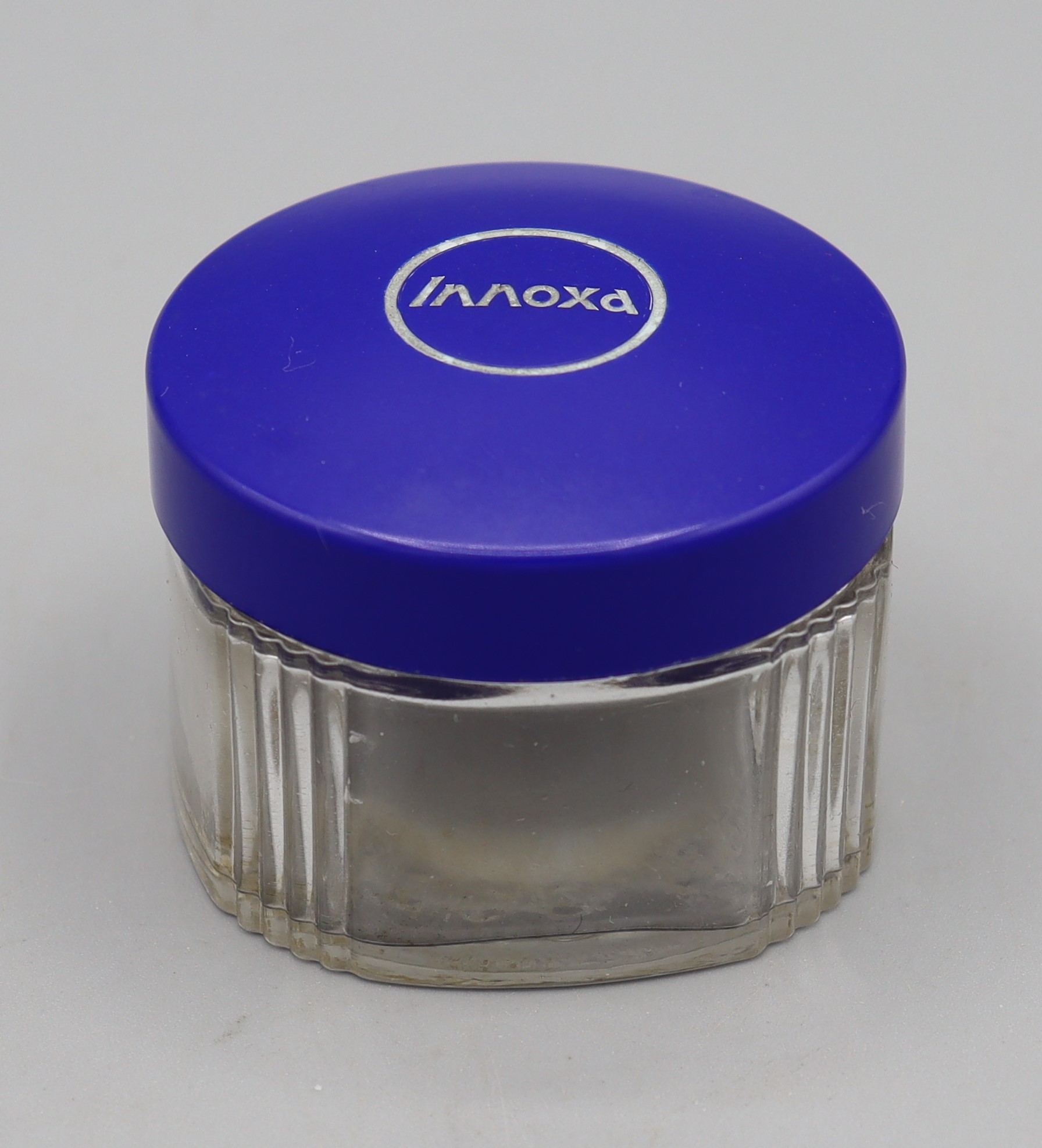 B4_008503 Innoxa Glass Bottle Item Reference: 008503 Category: Personal Accessories (Cosmetics) Format: Artefact Description: Glass bottle, with a blue plastic top, labelled ‘Innoxa’. Date: Further Information: ‘Innoxa’ is an Australian company Links: B4_008503_1