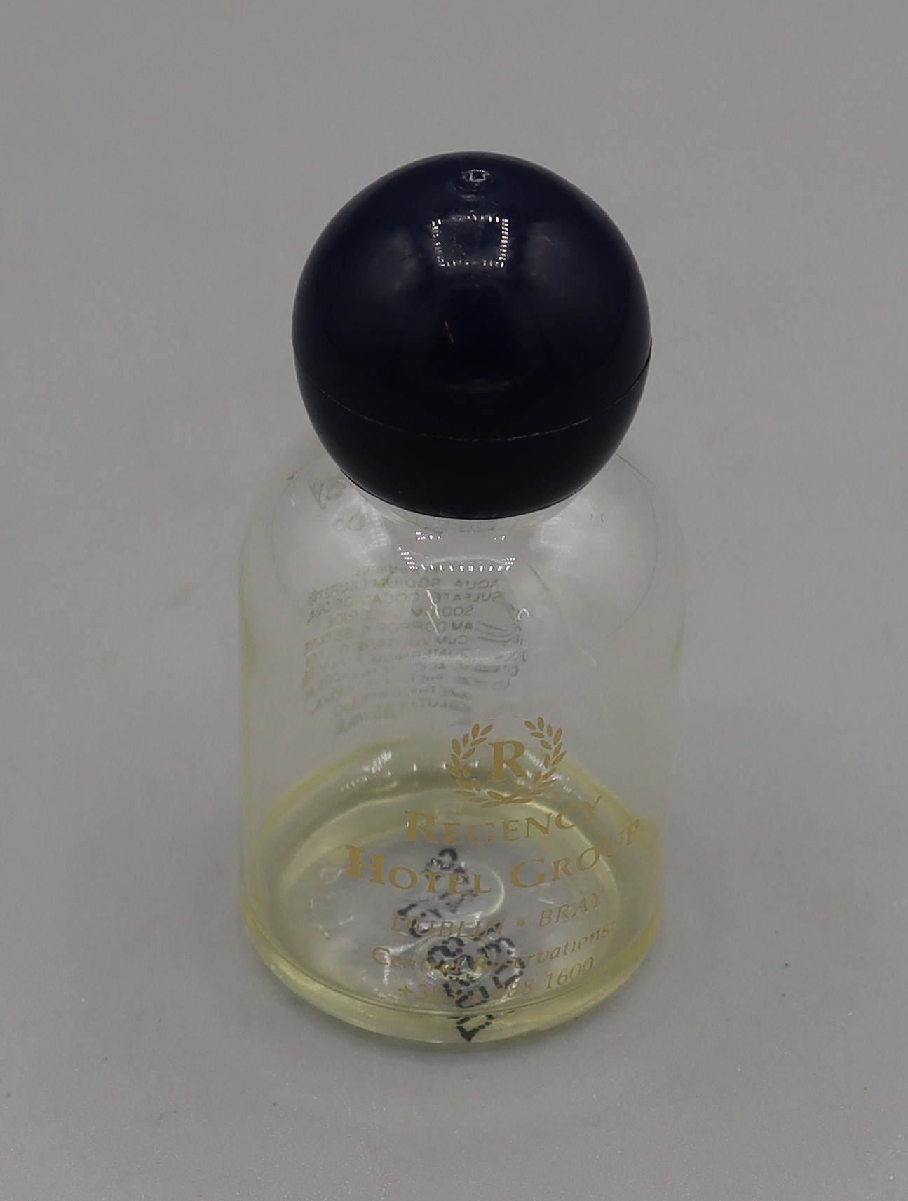 Description: Glass bottle with blue plastic top, labelled ‘R Regency Hotel Group Dublin; Hair & Body Shampoo