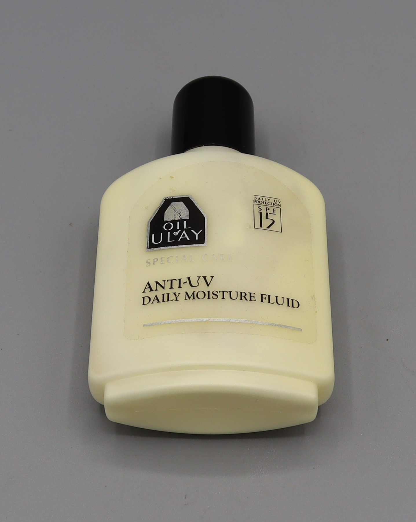 Description: Yellow plastic bottle, with a black plastic top, labelled Oil of Ulay ‘Special Care Anti-UV Daily Moisture Fluid, SPG 15’, 100 ml