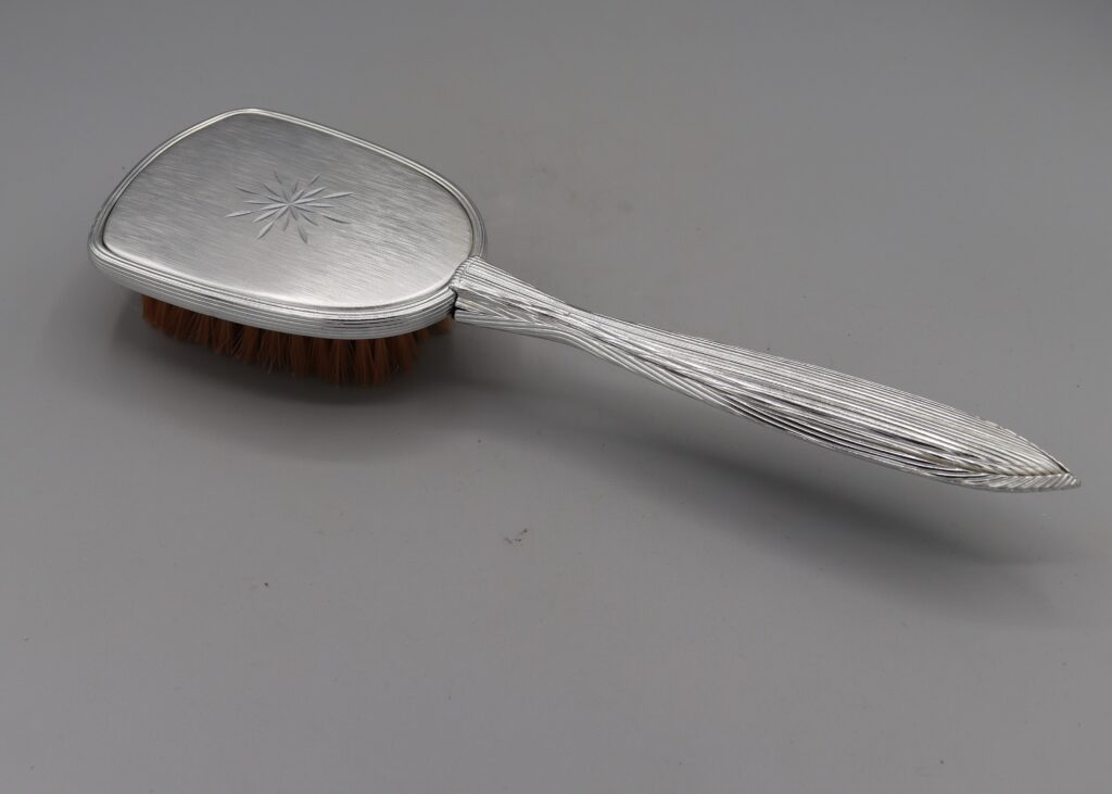 Description: Metal-framed dressing table hair brush. 270mm long. Head 110mm x 80mm,with ribbed pattern handle, 160mm long. Starburst pattern on back of brush. Nylon bristles set in a wooden inset in head. Made in England.