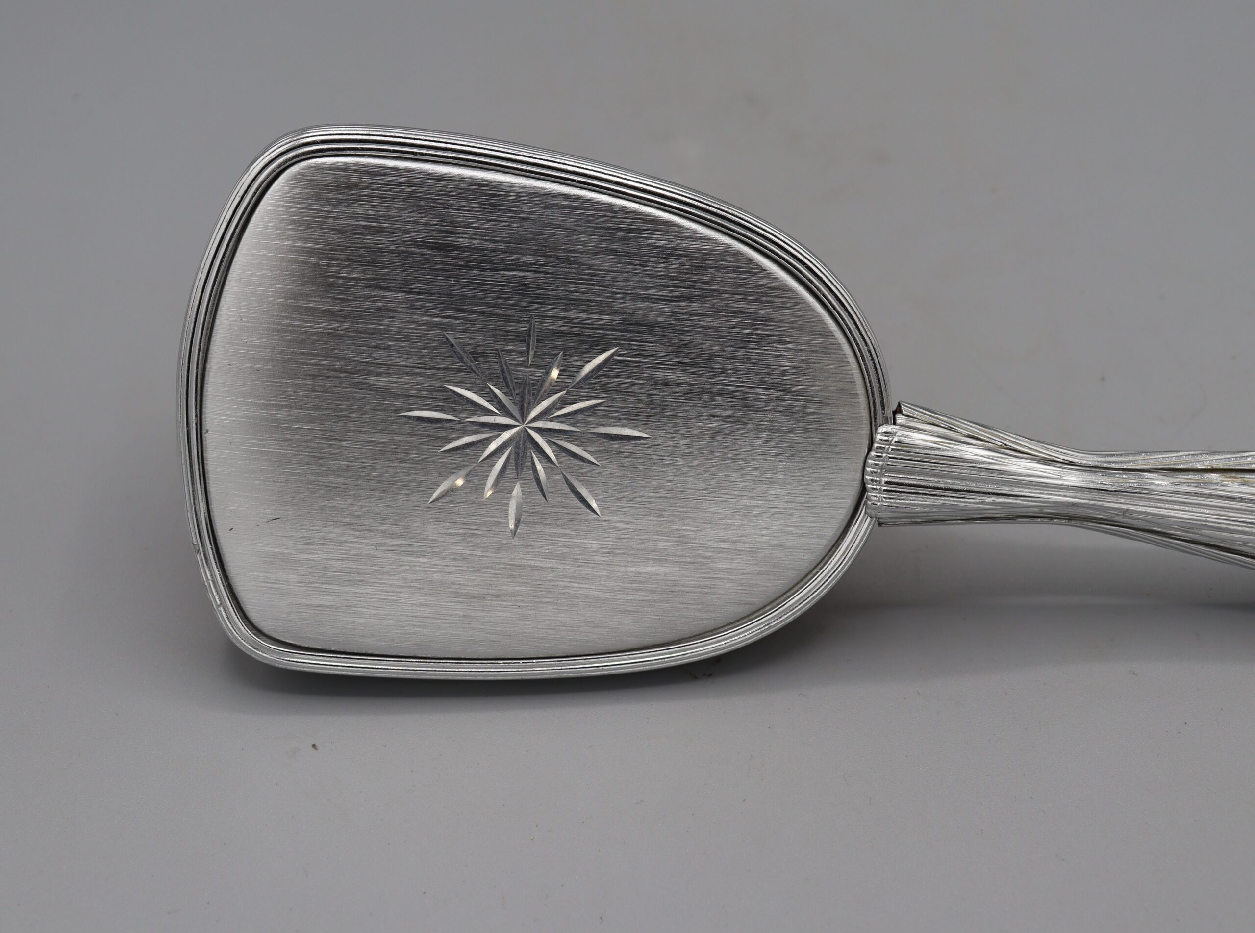 Description: Metal-framed dressing table hair brush. 270mm long. Head 110mm x 80mm,with ribbed pattern handle, 160mm long. Starburst pattern on back of brush. Nylon bristles set in a wooden inset in head. Made in England.