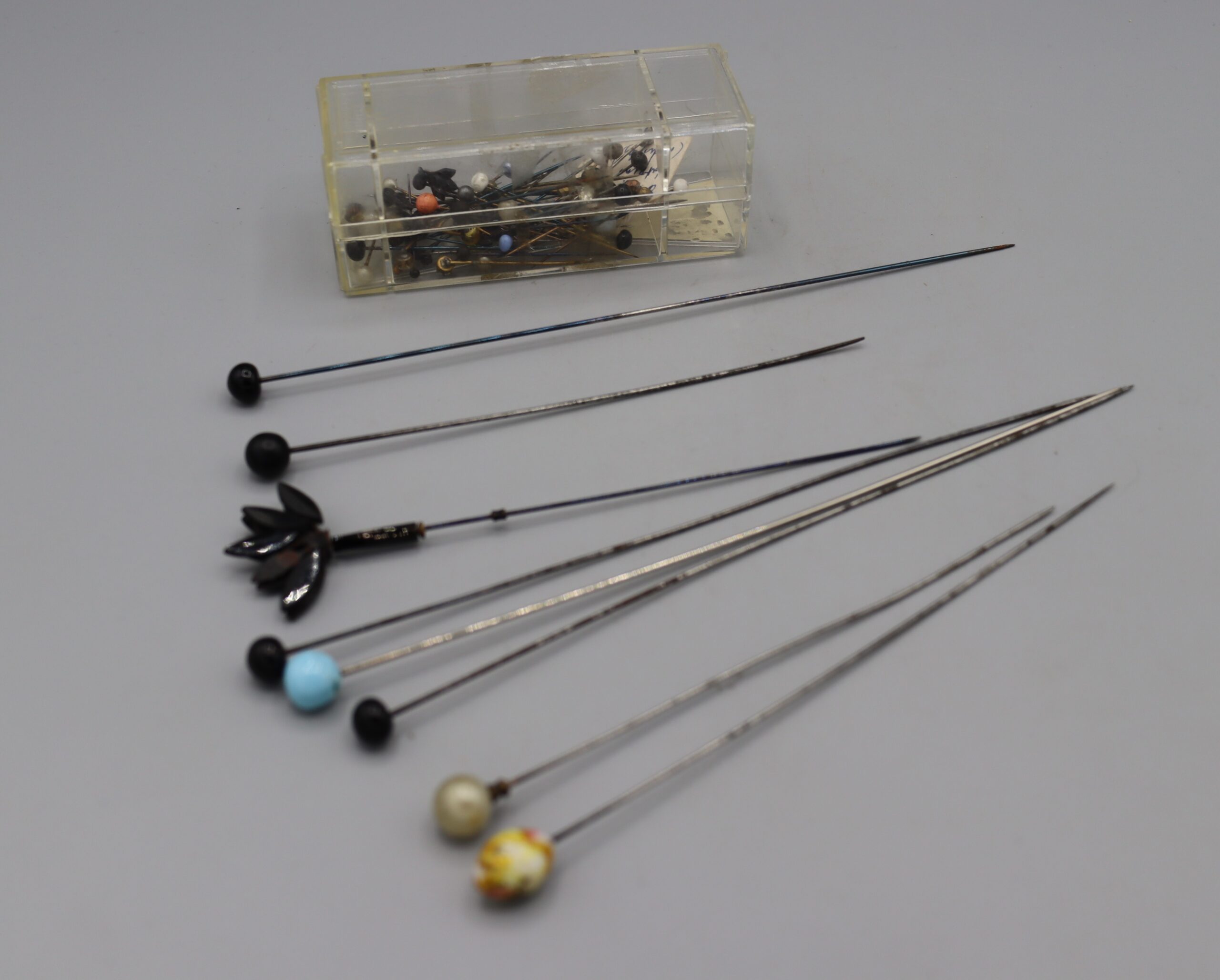 Description: 8 assorted hat pins. 3 x 200mm long with black beads on ends; 1 x 150mm long with black bead; 1 x 205mm long with blue bead; 1 x 170mm long with multicoloured ceramic bead; 1 x 150mm long with ‘pearl’ bead; 1 x 155mm long with black plastic decoration on end. Plastic box, 103 x 40 x 40mm containing 64 medium and assorted small pins.