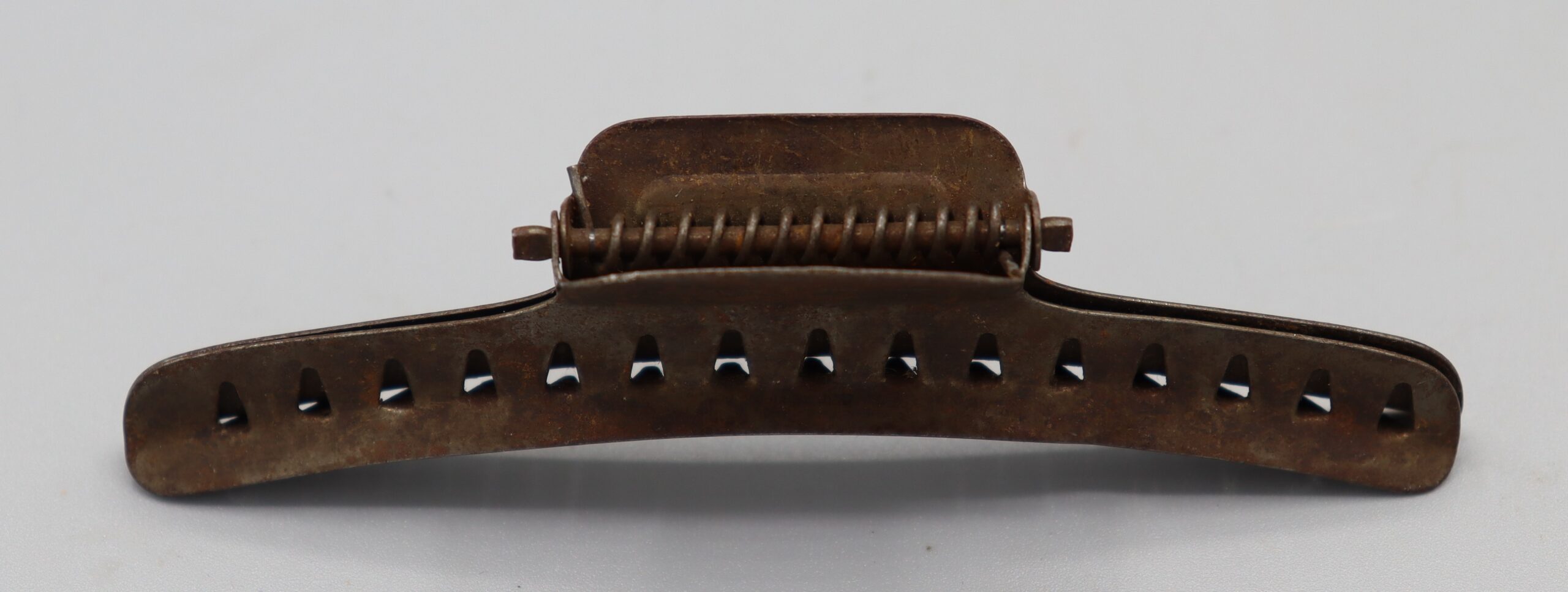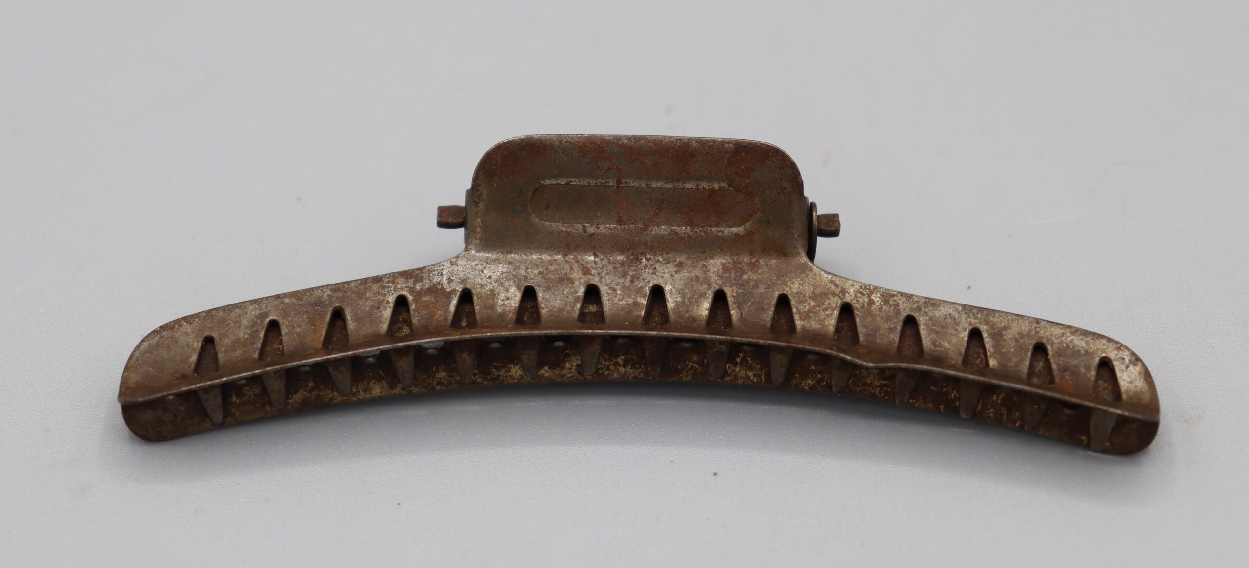 B6_008600 Hair Waving Grip Item Reference: 008600 Category: Personal Accessories (Ladies Hair) Format: Artefact Description: Curved, metal, hinged clip for creating waves. 97mm across. Pointed teeth on inside of each ‘blade’. Date: Further Information: Links: B6_008600_2 B6_008600_1