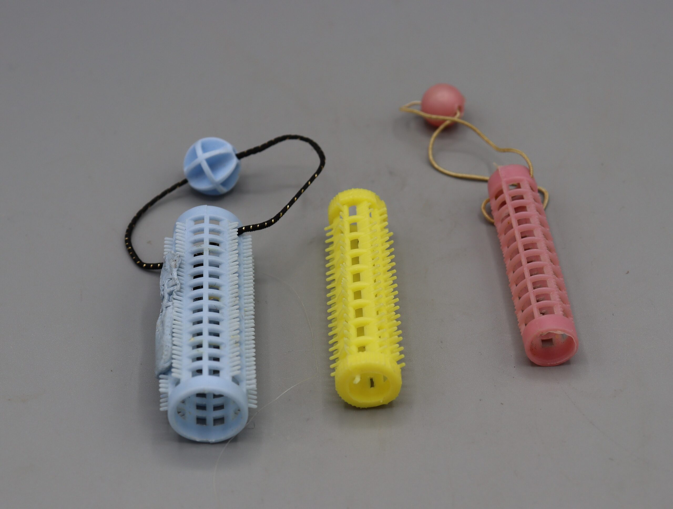 Description: 8 hair rollers. 4 x blue plastic hair rollers, 20mm diameter, 60mm long, all with elastic and plastic bobbles for holding in place; 3 x yellow plastic hair rollers, 15mm diameter, 60mm long. No elastic or bobbles; 1 x pink plastic hair roller, 11mm diameter, 60mm long, with perished elastic and bobble attached.