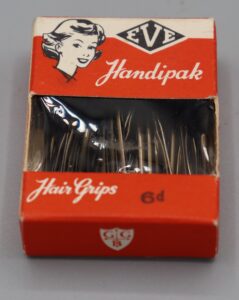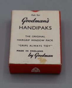 The pack, made of cardboard with see through plastic window on the front,  contains 37 Kirby Grips. The wording on the front is ‘EVE Handipak Hair Grips 6d.’ and it features a retro design with a woman’s portrait. The wording on the back is ‘Ask for Goodman’s HANDIPAKS The original hairgrip window pack’ ‘Grips always tidy’, ‘Made in England by Goodman’