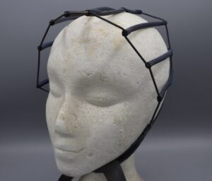 An elasticated cap with 8 crosspieces and ribbons ties at either end is contained in a packet with instructions for use. Also leaflet describing other Butywave products. Blue rigid, curved plastic rod.